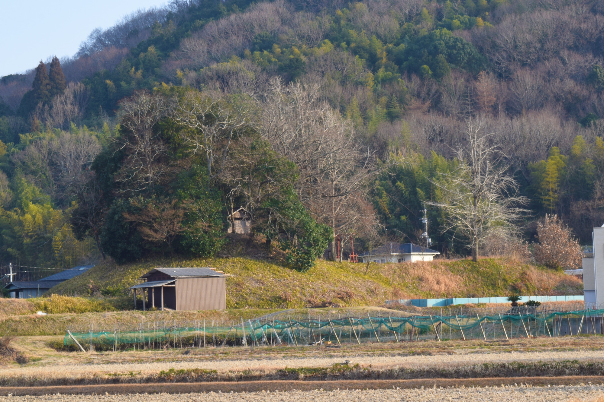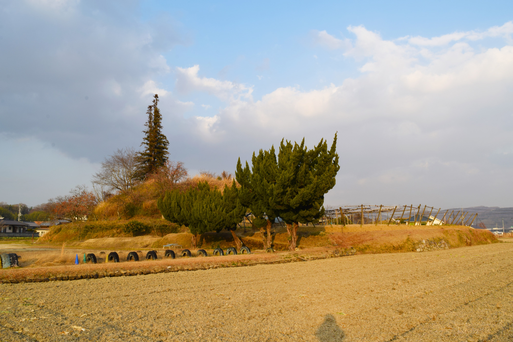 「朱千駄古墳(しゅせんだこふん)」は墳丘の全長85メートルの前方後円墳です。石棺の中に大量の赤い顔料が残されていたことが古墳名の由来だそうで、被葬者はかなりの有力者であったと考えられます。写真中央の木立ちになった小さな高まりが後円部で、写真の左手に向かって前方部が展開しています。