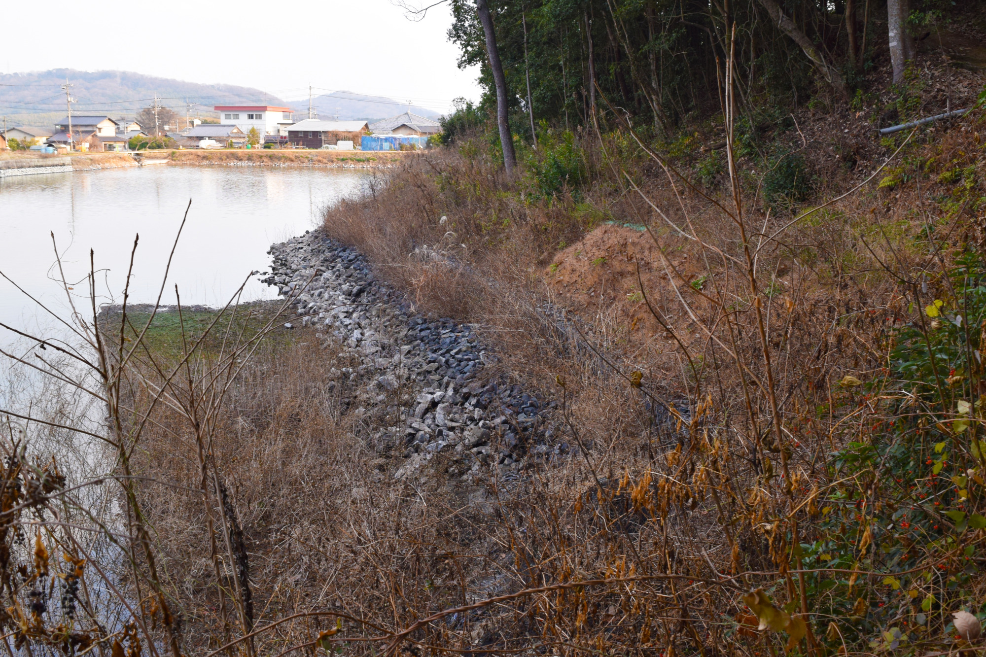 周濠が明確に残る古墳は岡山では希少ですが、発掘調査によって周濠はかつて二重にめぐっていたことが判明しました。墳丘の裾の部分は長年にわたって濠の水による浸食を受けていたため、平成29年から8年かけて護岸工事が施されました。