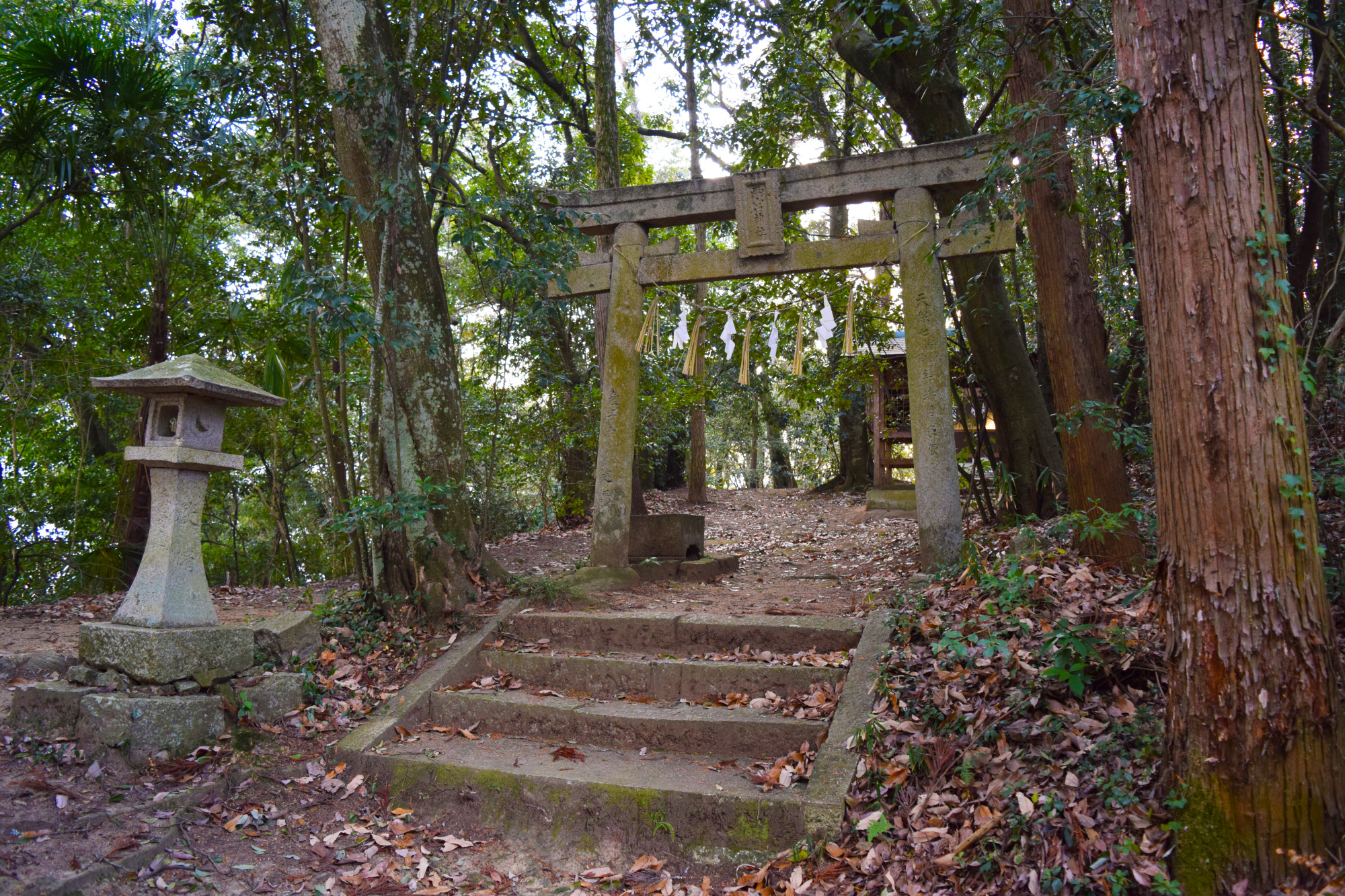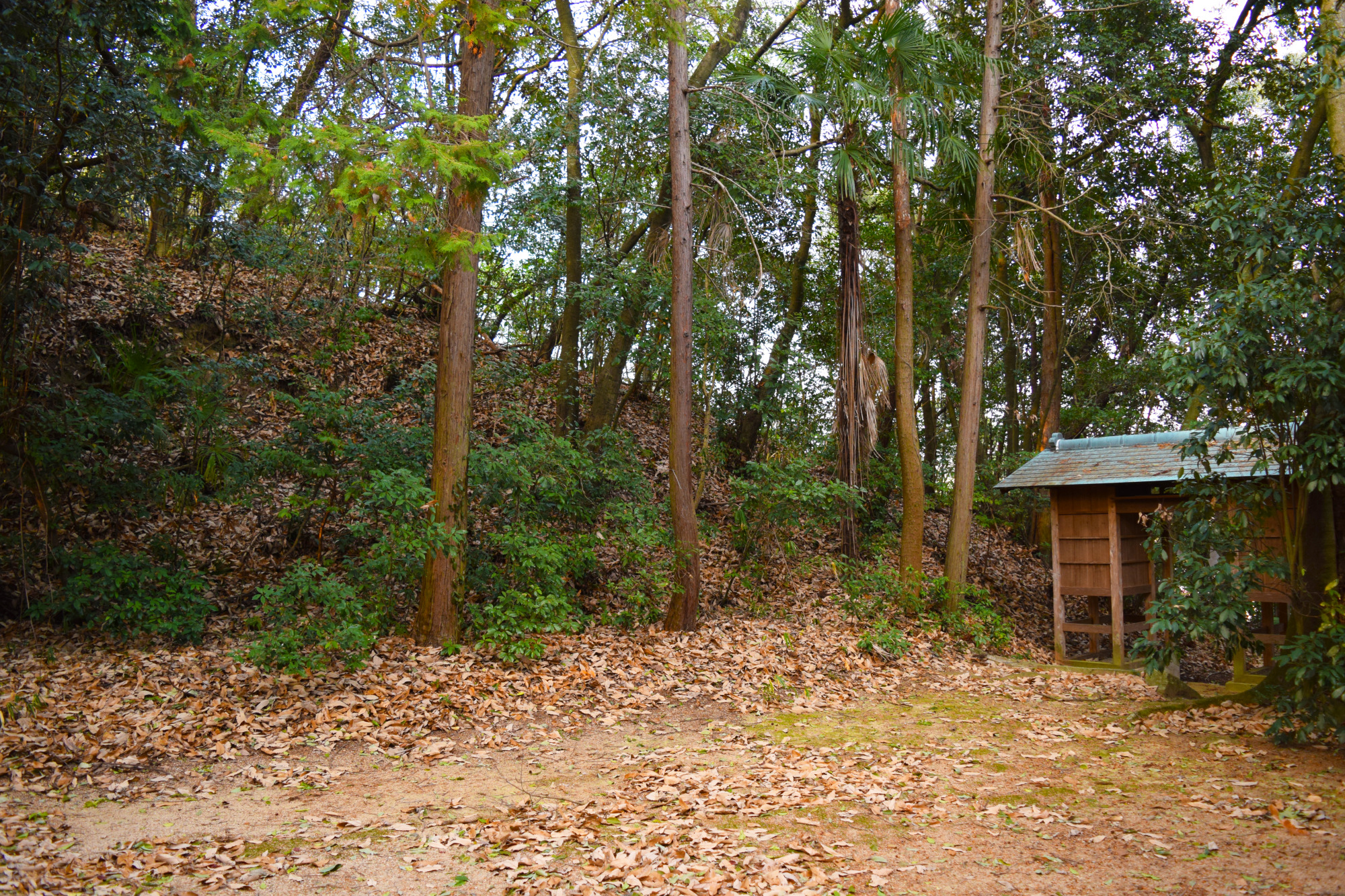 周濠の一部は陸続きなので墳丘へ登ることが可能です。前方部には「両宮神社」が鎮座し、境内では墳丘が段になっている様子を明瞭に視認できます。
