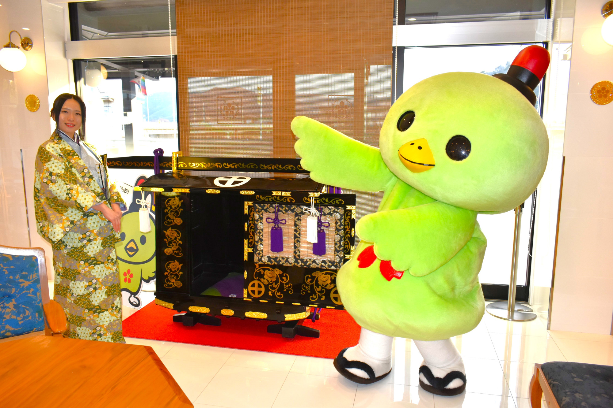 岡山県内の市町村には各自治体でPR活動を行っているご当地キャラクターがたくさんおる。そのキャラクターたちと地元の観光スポットを案内する第一弾として、若者にも人気の江戸時代の宿場町の面影が色濃く残る町・矢掛町のマスコットキャラクター「やかげ観光大使 やかっぴー」をご紹介いたそう。岡山戦国武将隊の宇喜多直家の妻・おふく(円融院)と池田光政の妻・勝姫が、やかっぴーと一緒に矢掛町のスポットをまわって参った。