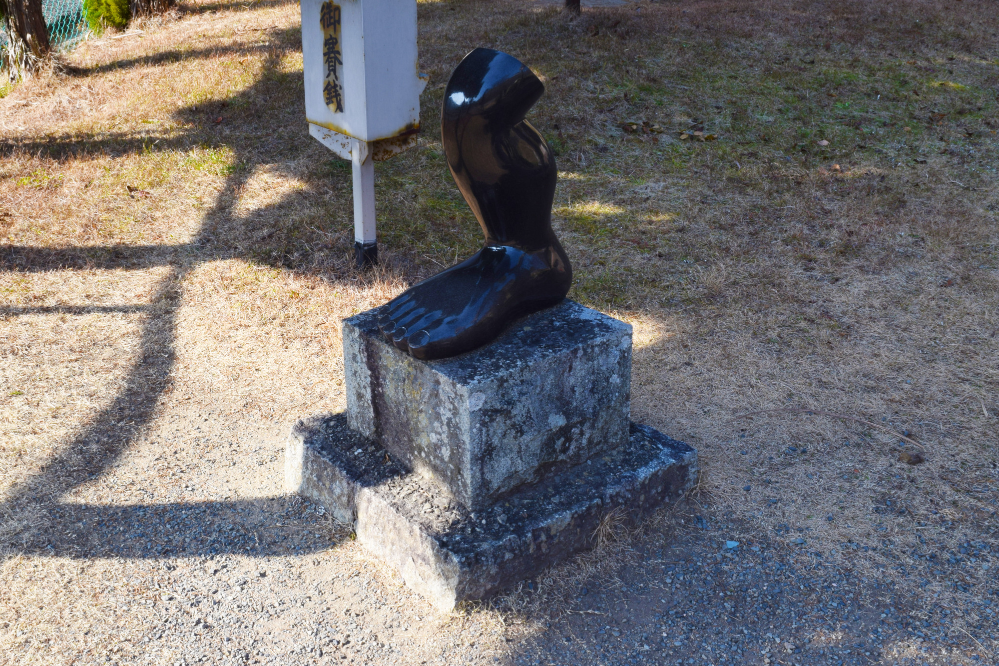 参道には石造の「足形」が鎮座しています。ご祭神は「足名椎命(あしなづちのみこと)」「手名椎命(てなづちのみこと)」で、ヤマタノオロチ神話に出てくる「櫛名田比売(くしなだひめ)」のご両親です。