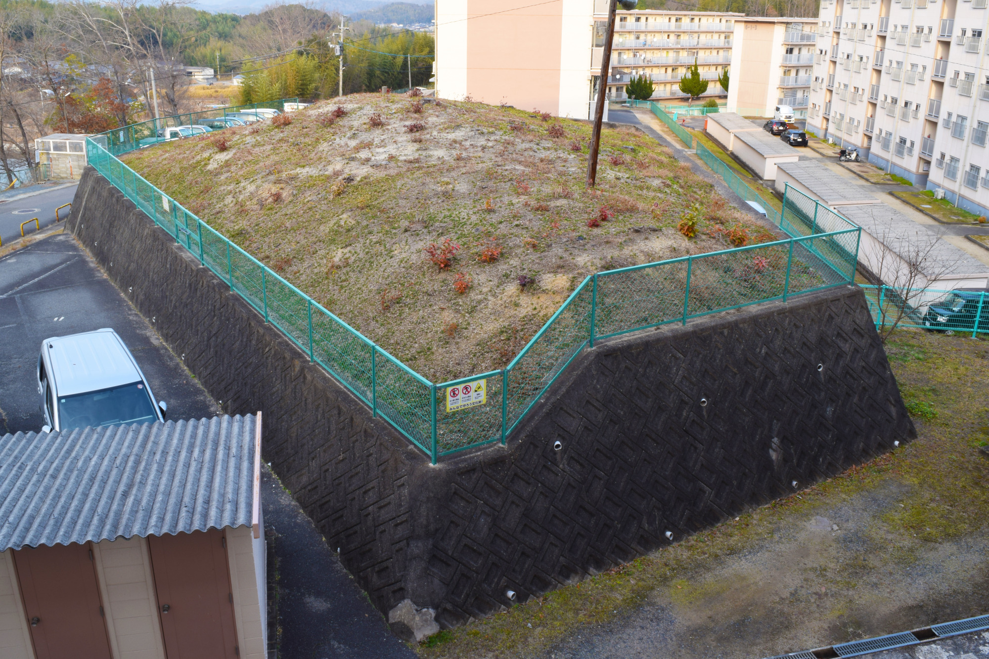 「便木山(びんぎやま)8号墳」は古墳時代の「方墳」か、あるいは弥生時代の「方形台状墓」と考えられています。団地の造成区域から除外されて、周囲を擁壁で囲むことによって現状保存されました。