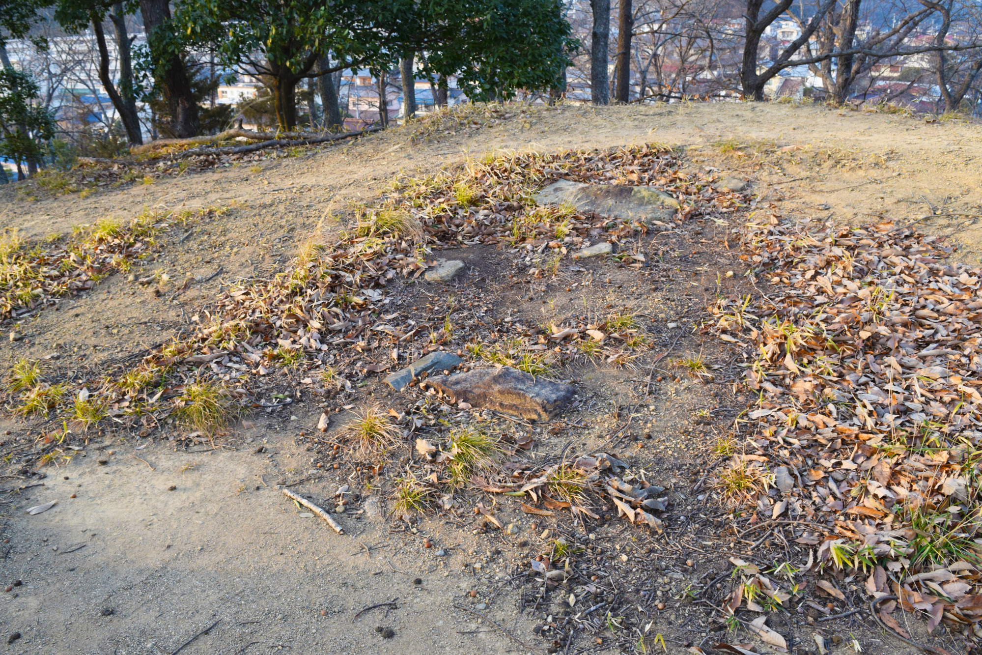「野山古墳群」は「弥生公園」という緑地公園内にあります。東西方向と北へ延びる尾根にかけて13基の小さな円墳があり、すべて現状保存されました。こちらも個別の案内表示はなく、どれが古墳なのかよくわからない状態でしたが、「野山2号墳」の箱式石棺の一部とされる石を確認できました。