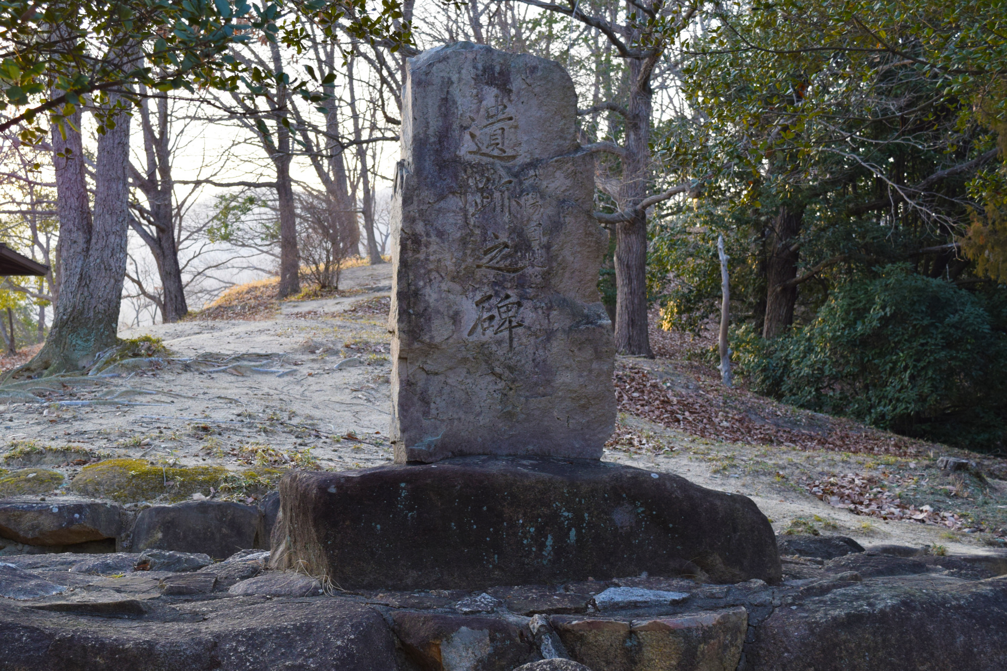 「弥生公園」には「遺跡之碑」という記念碑が建っています。造成工事によって消滅した墳墓群を慰霊するためのもので、石材には「岩田8号墳」の石室の石が転用されています。当初は消滅する「岩田8号墳」の横穴式石室をここへ移して復元する予定でしたが、「岩田14号墳」が発見されて現状保存されることが決まり、8号墳の復元計画は変更され記念碑に転用されることになったそうです。