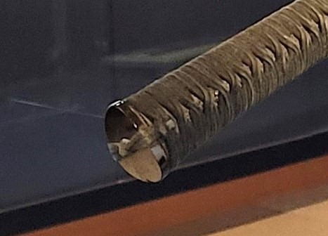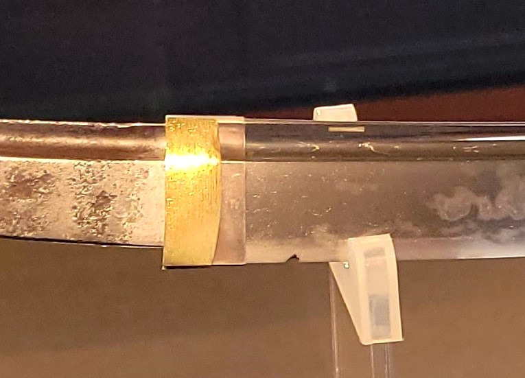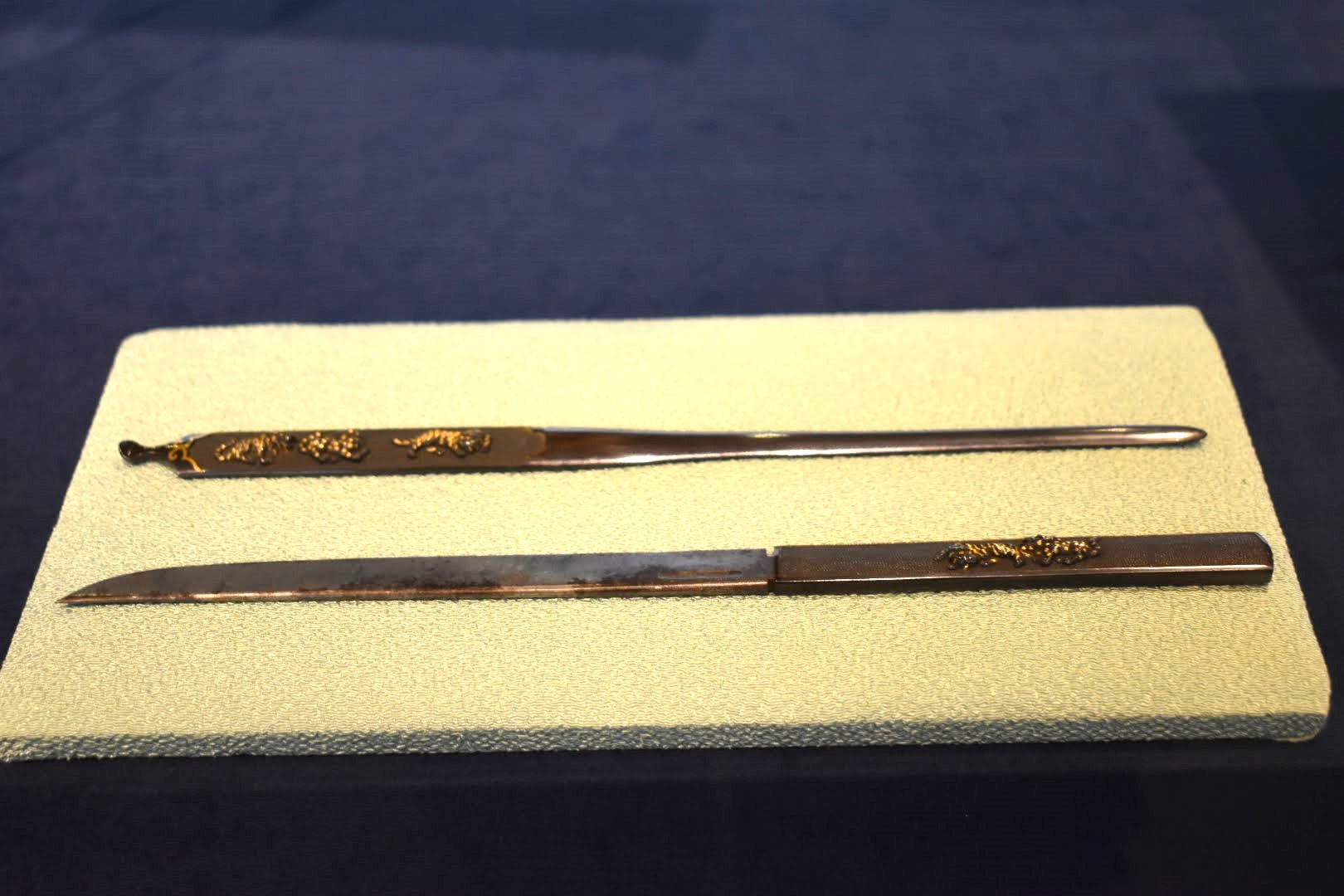忘れてはならないのが拵です。刀の拵は、日本刀を実際に携行・使用するための外装一式を指します。刀そのもの(刀身)とは別物で、機能性と美意識が強く表れる世界です。拵は消耗品扱いだったため、現存する完全形は意外と少ないです。山鳥毛には付属する拵も伝わっており、この拵も含めて国宝に指定されています。山鳥毛の拵は、鐔(つば)を持たない合口造で、派手さのないつくりです。しかし、小柄(こづか)と笄(こうがい)が仕込まれており、格式あるものです。