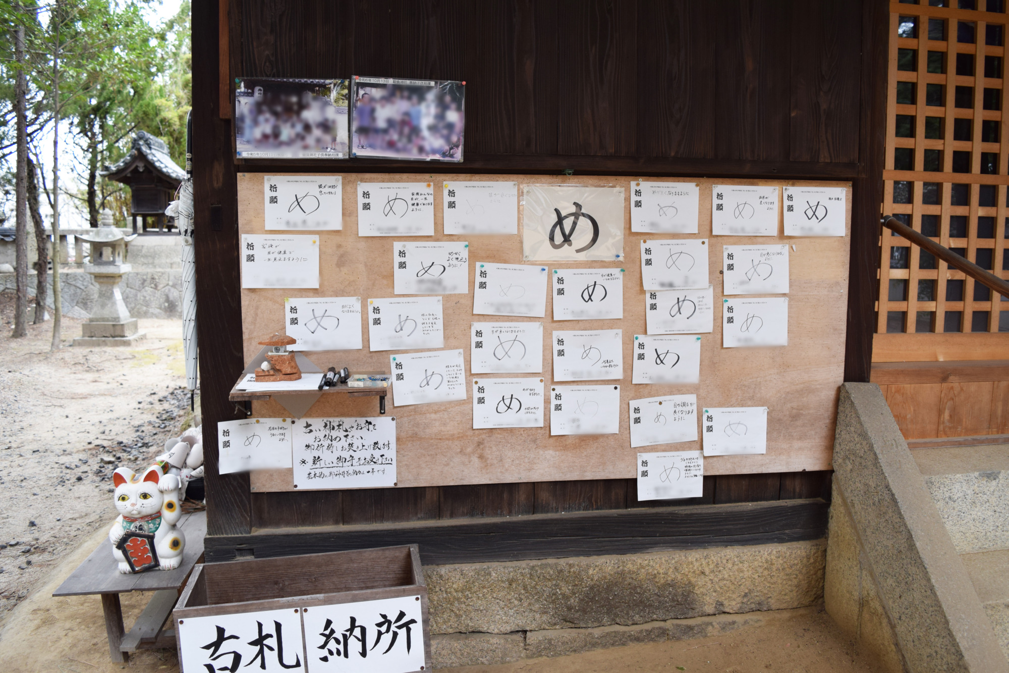また、足利尊氏が目を患った際に当神社で祈願すると回復したという伝承もあり、眼病平癒の御利益がある神社としても知られています。刀剣の製作現場では炎をじっと見つめるので目を悪くする人が多く、長船の刀匠たちから篤い信仰を受けたそうです。現在でも、紙に「め」と書いて拝殿に貼るという祈願が行なわれています。