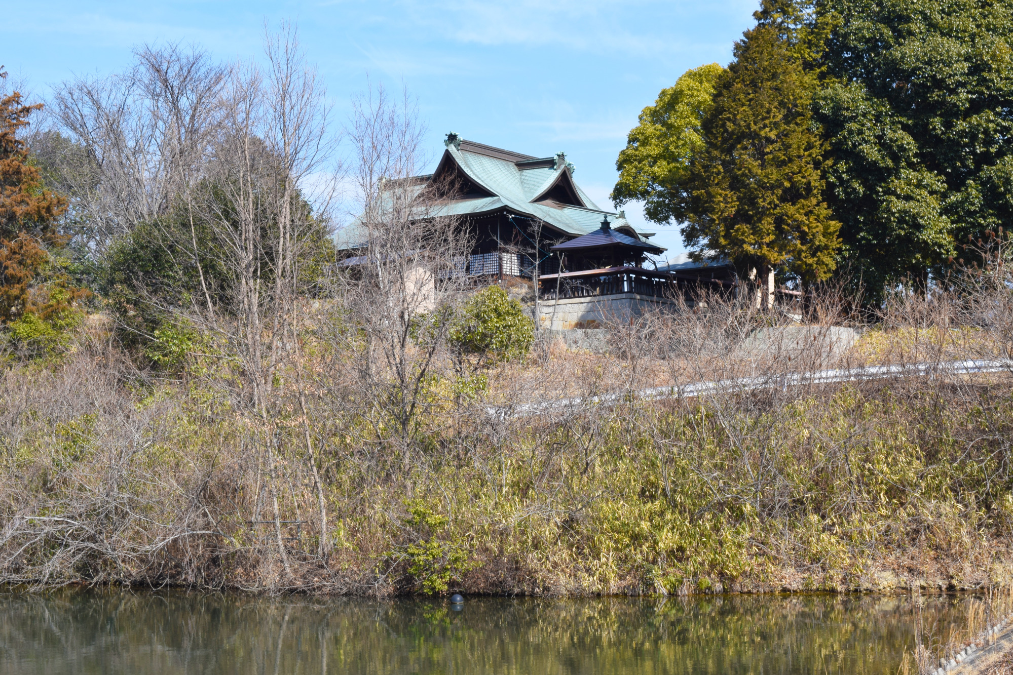 「神神社」は小高い山の上に鎮座していて、麓に広がる津高地区を見渡すことができます。その一方、傍らには満々と水をたたえた大きな池もあるという不思議なロケーションとなっています。