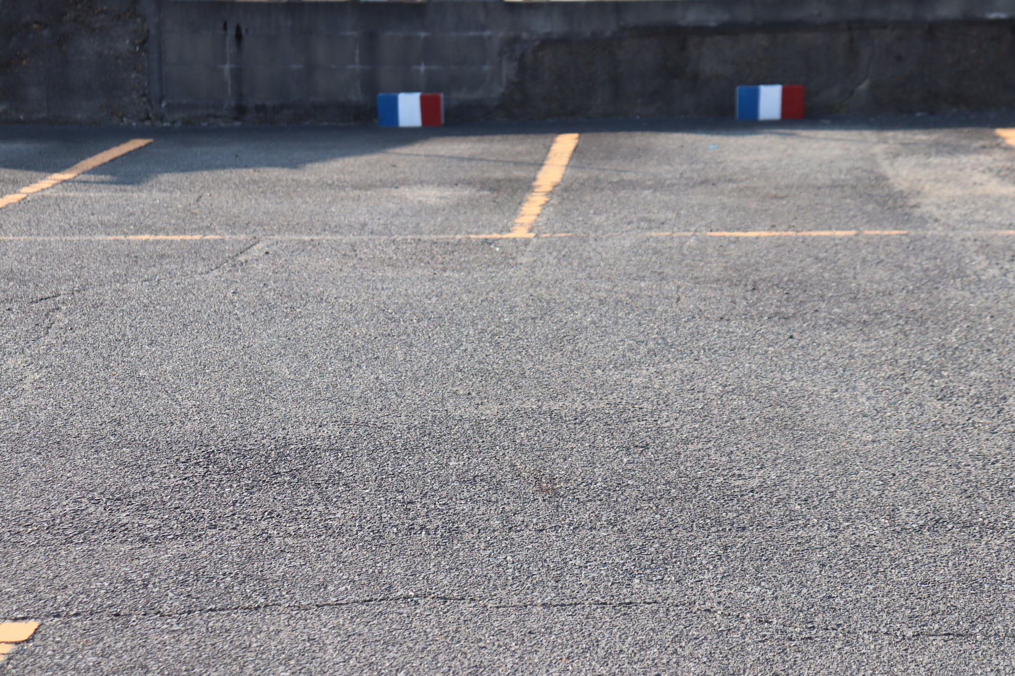 駐車場は店舗から少し離れています。国道250号に面したダスキン伊里支店の道を挟んで向かいの海沿いにあります。フランス国旗のカラーが目印のスペースに車を停めてから、道を渡ってしばし坂道を上って向かいます。