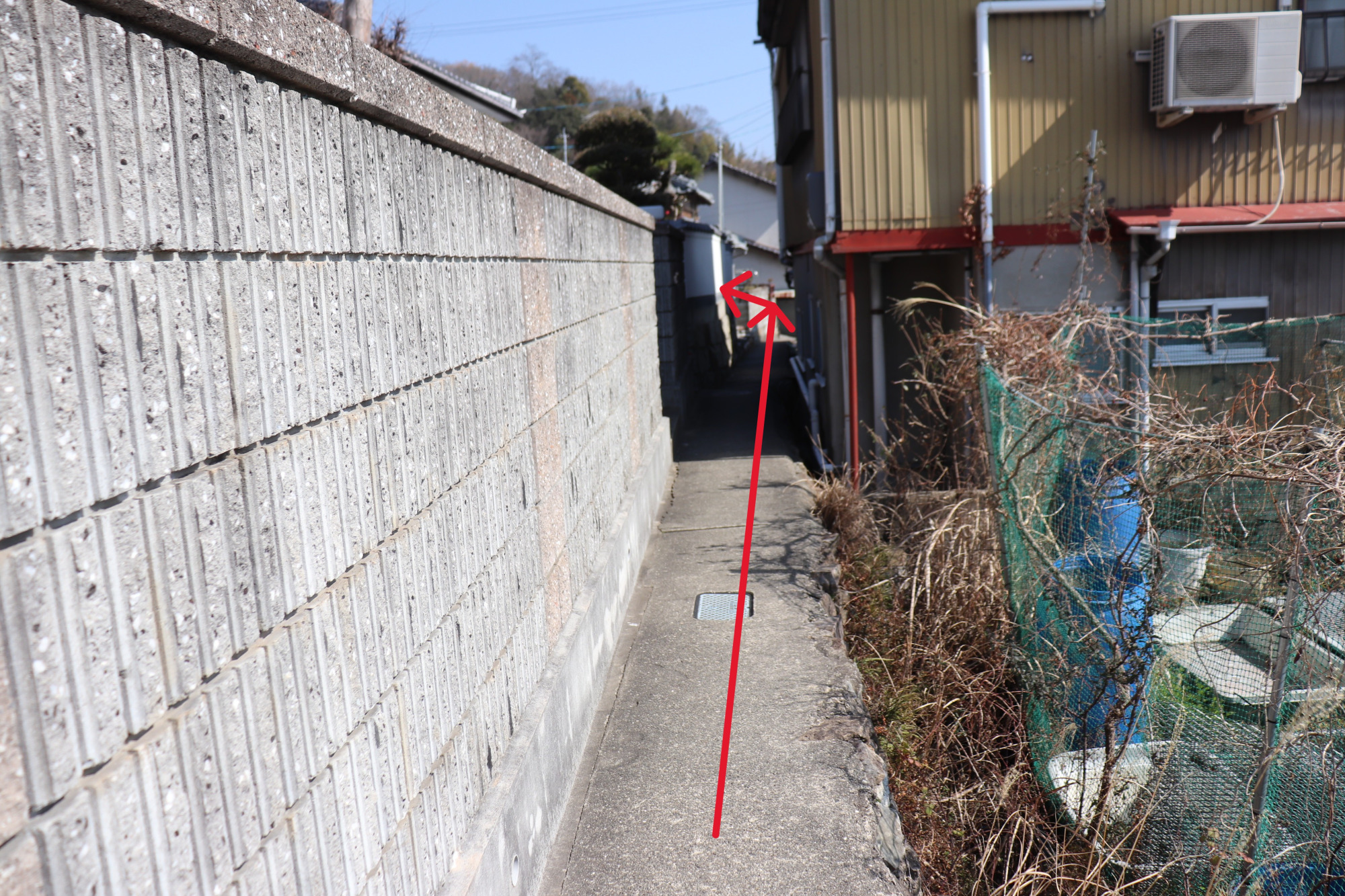 駐車場からお店は見えず、どこにあるか分からないので、ルート写真の説明に従っていきました。ダスキン伊里支店の左脇の道を上り、坂の途中にある朱赤のホース格納庫のところを右折すると、急に人が一人通れるくらいの細道になります。突き当りを左折して坂道を上るとフランス国旗色のブロックがあり、お店の姿が目に飛び込んできます。