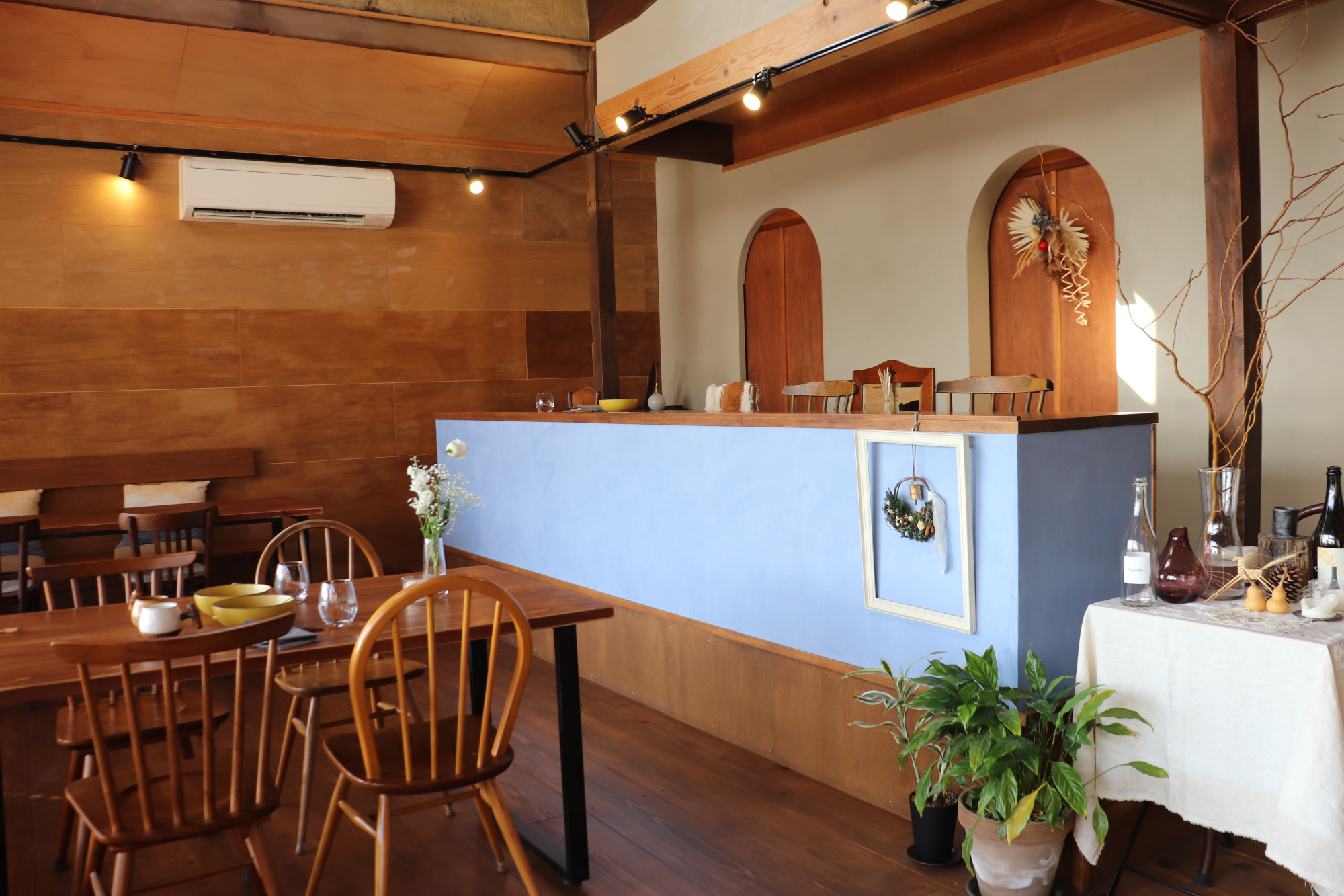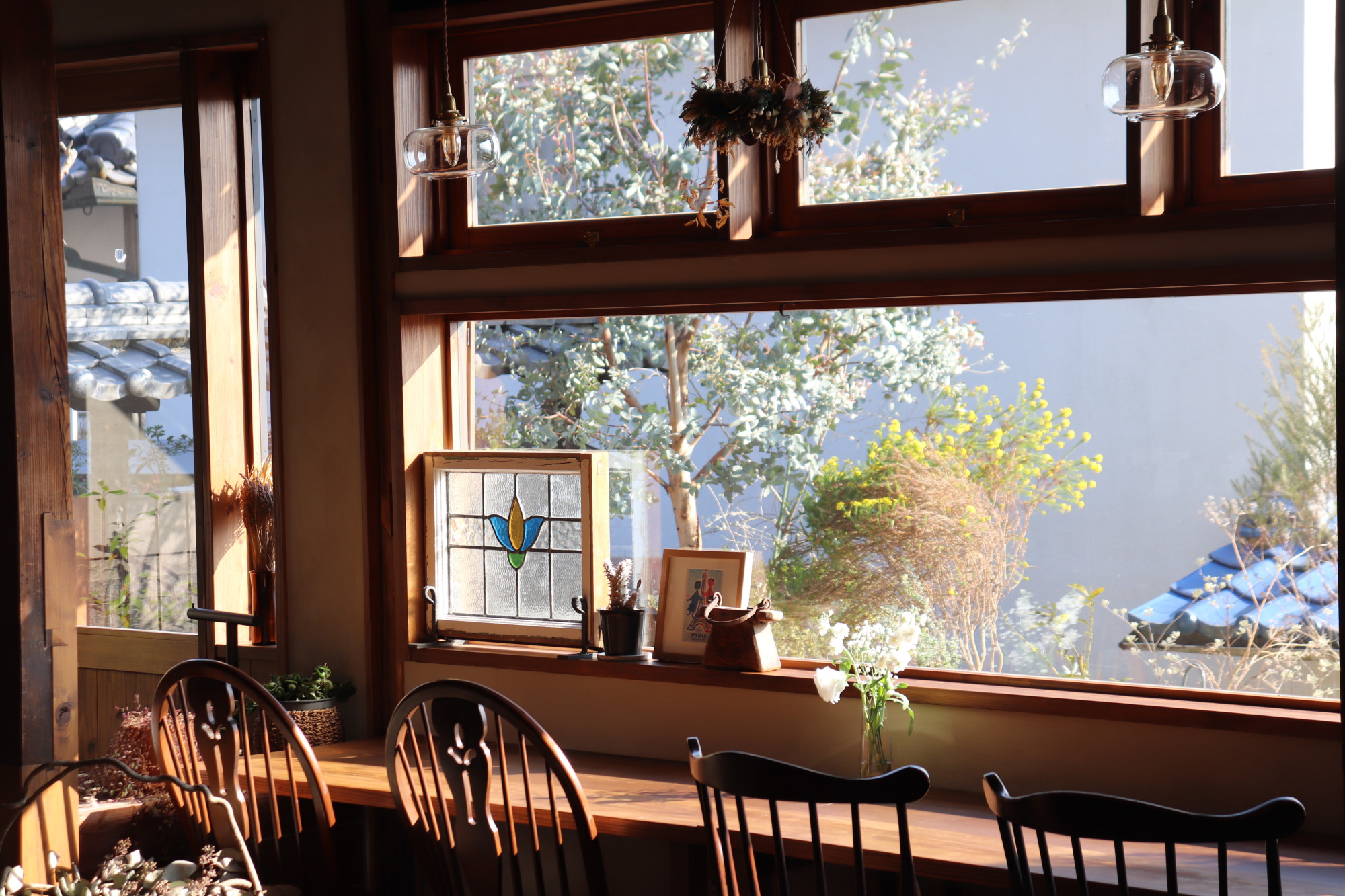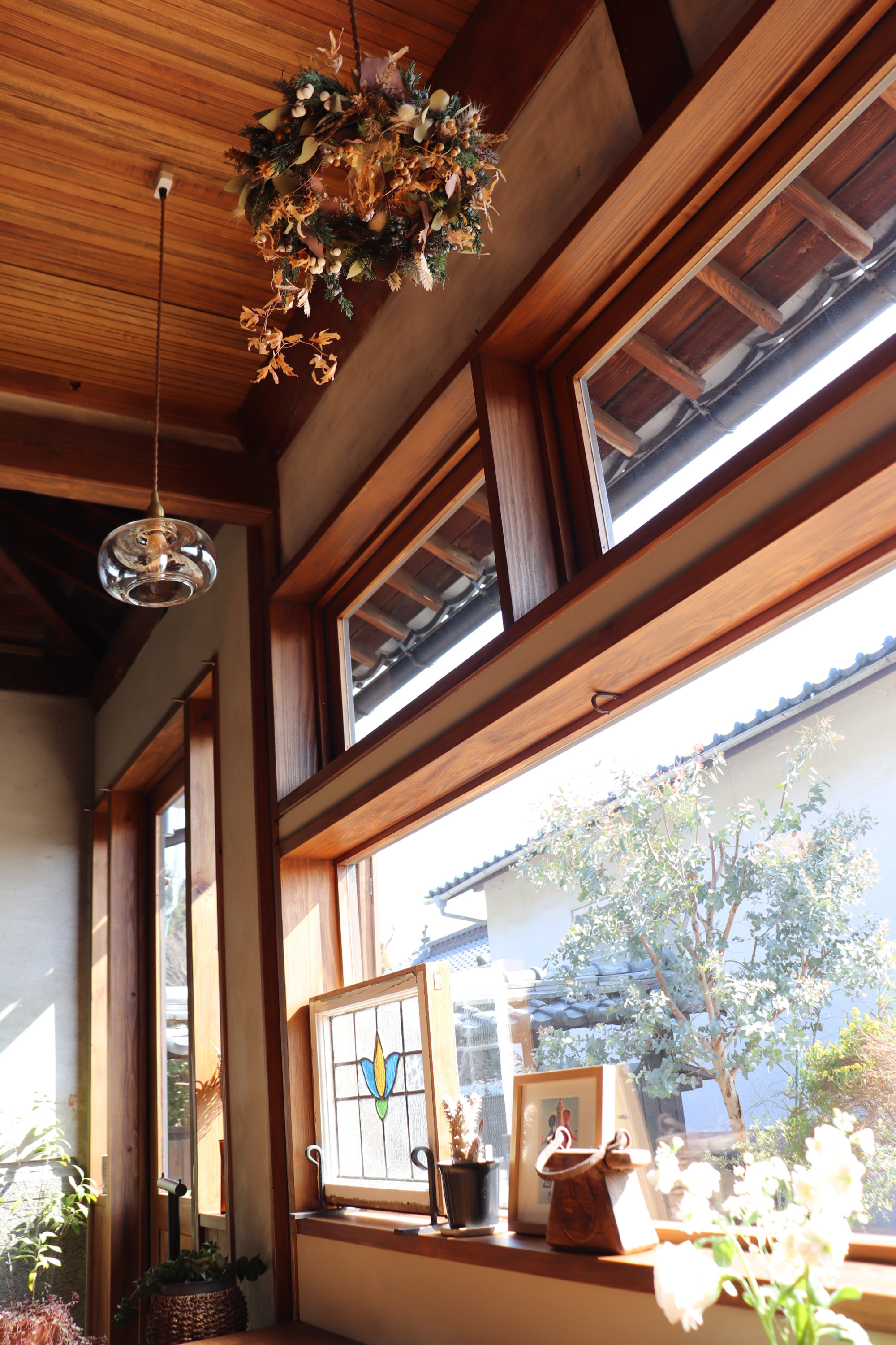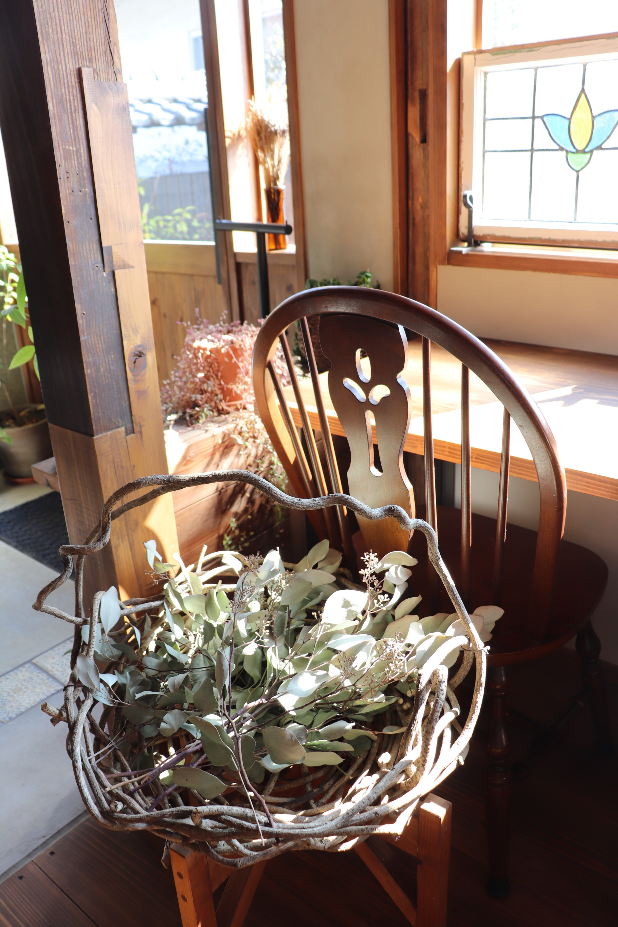 南向きのカウンター席には天井からドライフラワーのフライングリースが。そばには庭先のユーカリがドライフラワーとしてあしらわれ、各所にオブジェも飾られていて、古民家の雰囲気とよく合ったアンティークな感じが素敵です。日差しを受けるステンドガラスもアクセントになっていました。