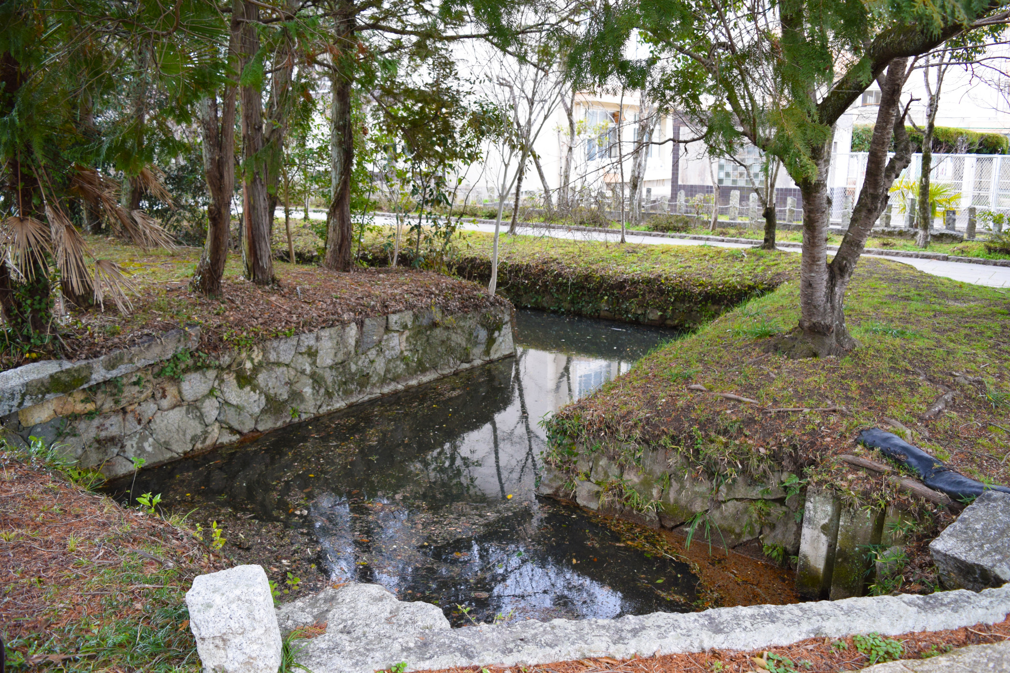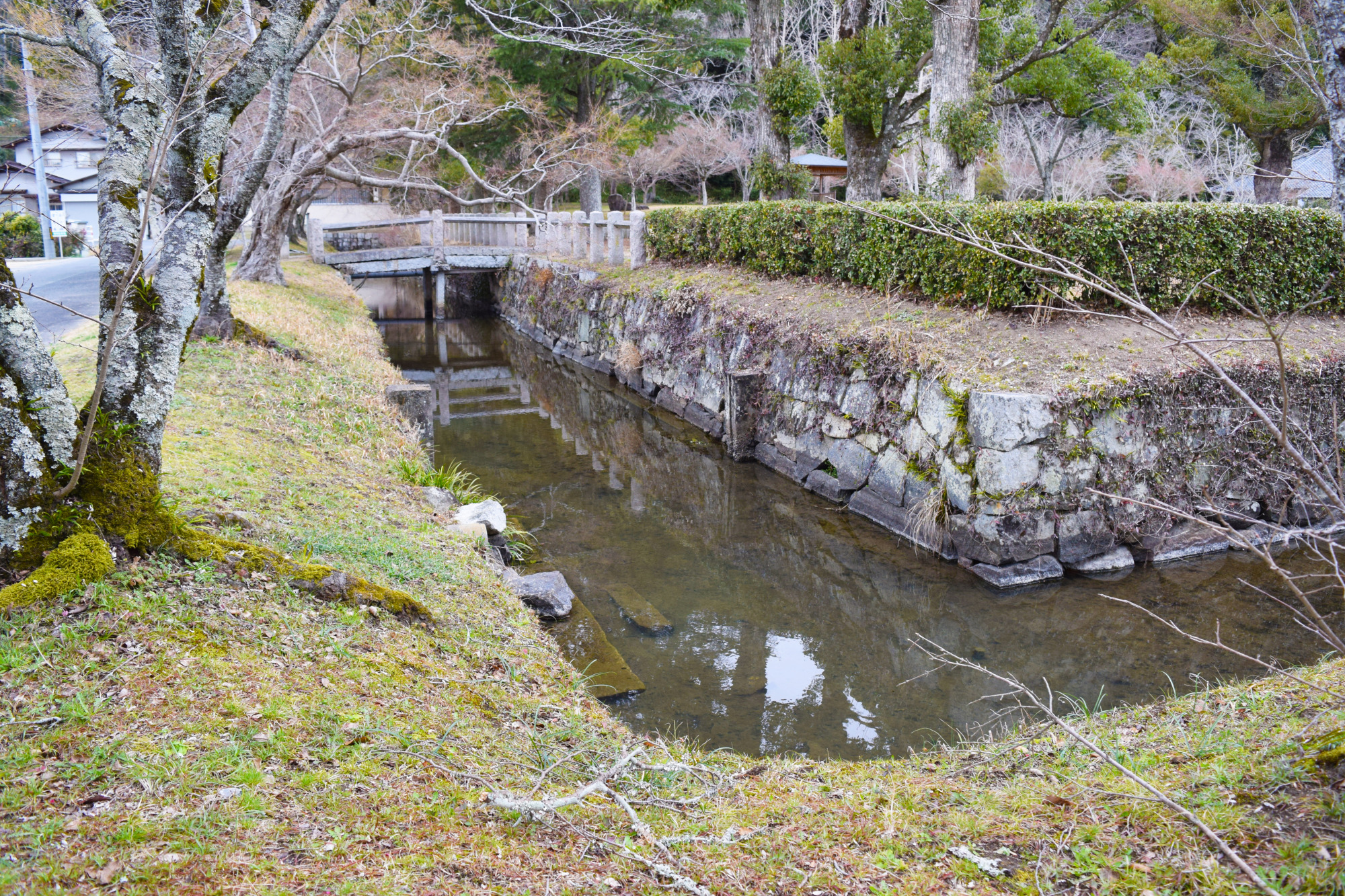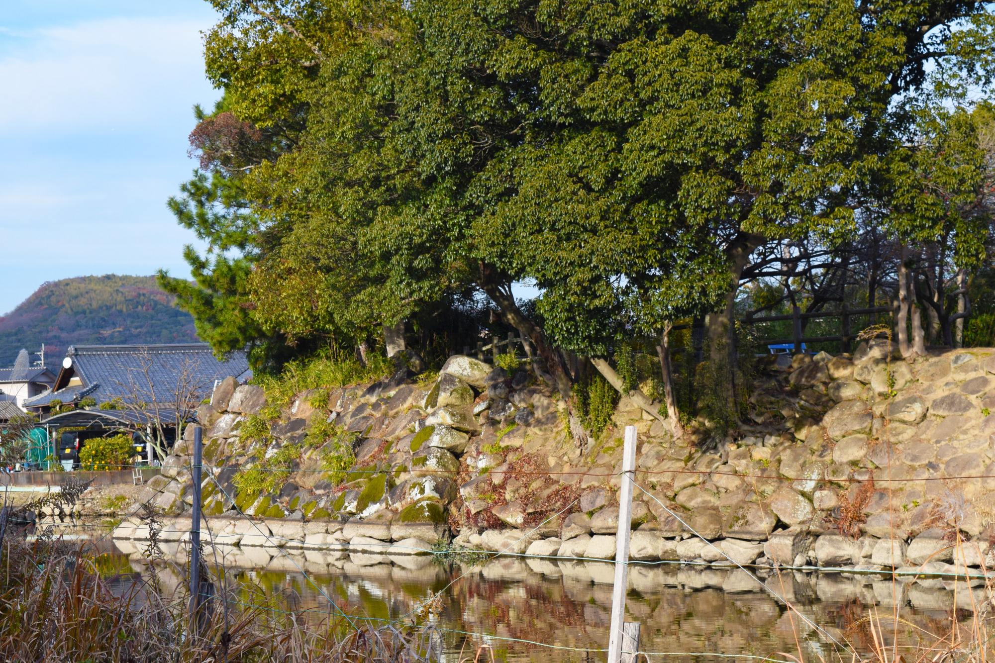 「撫川陣屋」は正確には「撫川知行所」なのですが、現在では「撫川城跡」と呼ばれています。確かに、城と呼びたくなるほど広い水堀と野面積みの立派な石垣が残されていますが、戸川氏が城を築くことはできないため、これらは旧庭瀬城の本丸の遺構ではないかと考えられます。