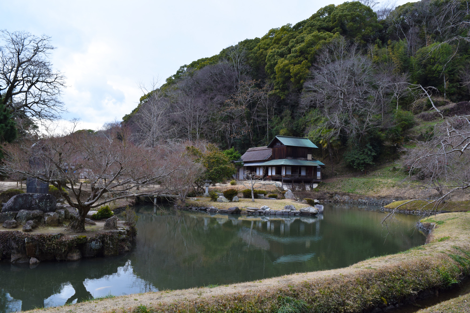陣屋跡のすぐ隣には足守藩の庭園「近水園(おみずえん)」が残されていて、うれしいことに入園は無料です。6代藩主の木下公定(きんさだ)が京都の「仙洞御所」(上皇のための御所)の修築に携わった経験をもとに造営したと言われています。数寄屋造りの「吟風閣」には、下賜された御所の残材が使用されているのだとか。