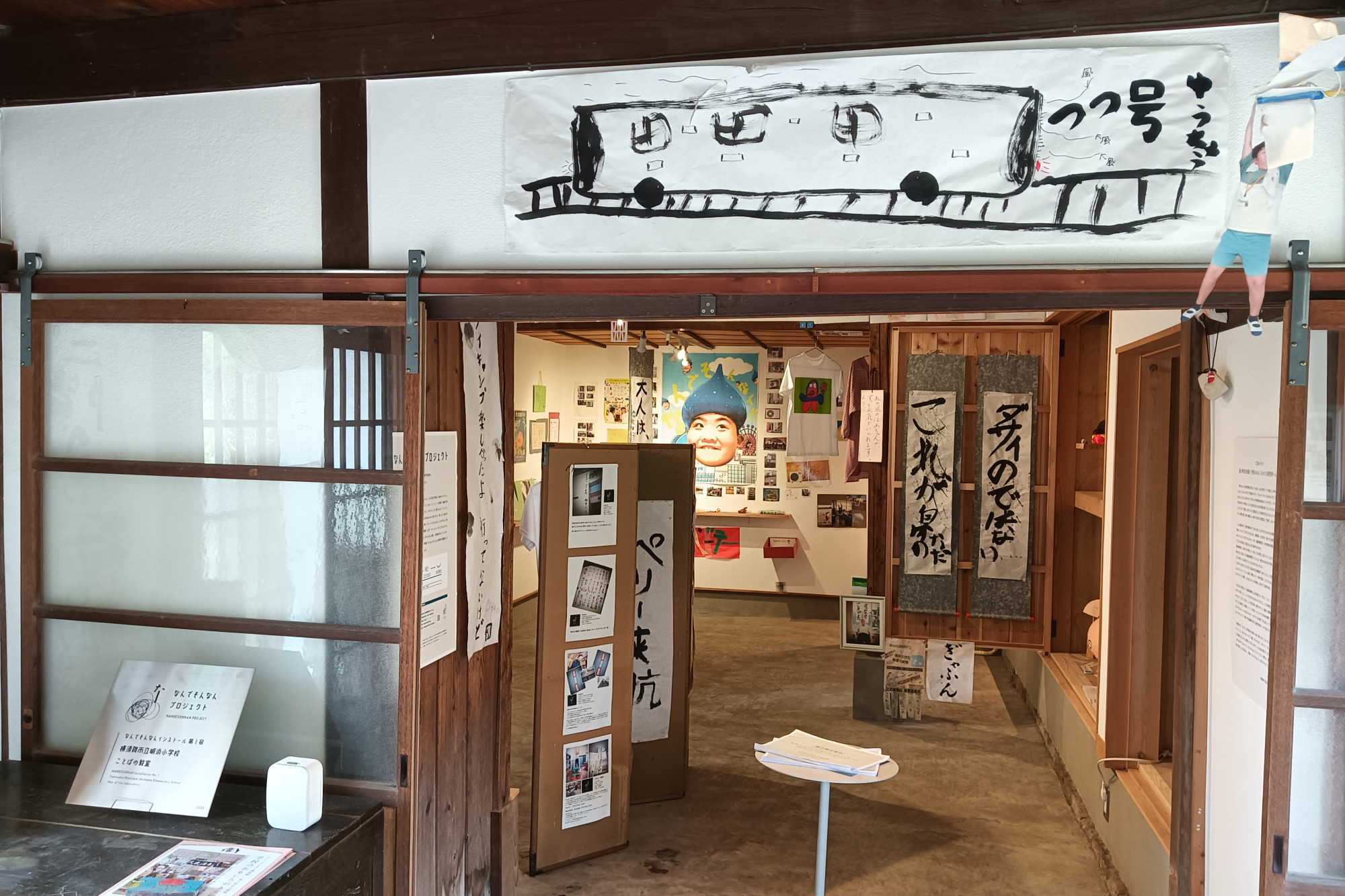 お店の中は入り口からは想像できないほど広いです。奥にある離れは現在「なんでそんなん博物館」と題された展示スペースになっています。人気のため会期を延長して展示しているとの事でした。横須賀市明浜小学校ことばの教室の教諭・高松智行さんと協働し、同教室の取り組みを通して、学校教育の新たな可能性を探った企画で、子どもの「違い」を「課題」として矯正するのではなく、ポジティブに解釈し、その中に個性や魅力を見出す「なんでそんなん!?」の視点を大切にして生まれた作品の数々が展示されています。くすっと笑えるものから、考えさせられるものまで、子ども達の視点が素晴らしいのでこの機会に是非。人への愛が詰まった企画で、永瀬さんの旧宅で行われるのにぴったりな企画だと思いました。会期終了日は決まっていないようですので、気になる方はお店にお問い合わせください。先述した「タイ国クワイ河開発協力隊編成本部」の看板はこの離れの裏口にあります。