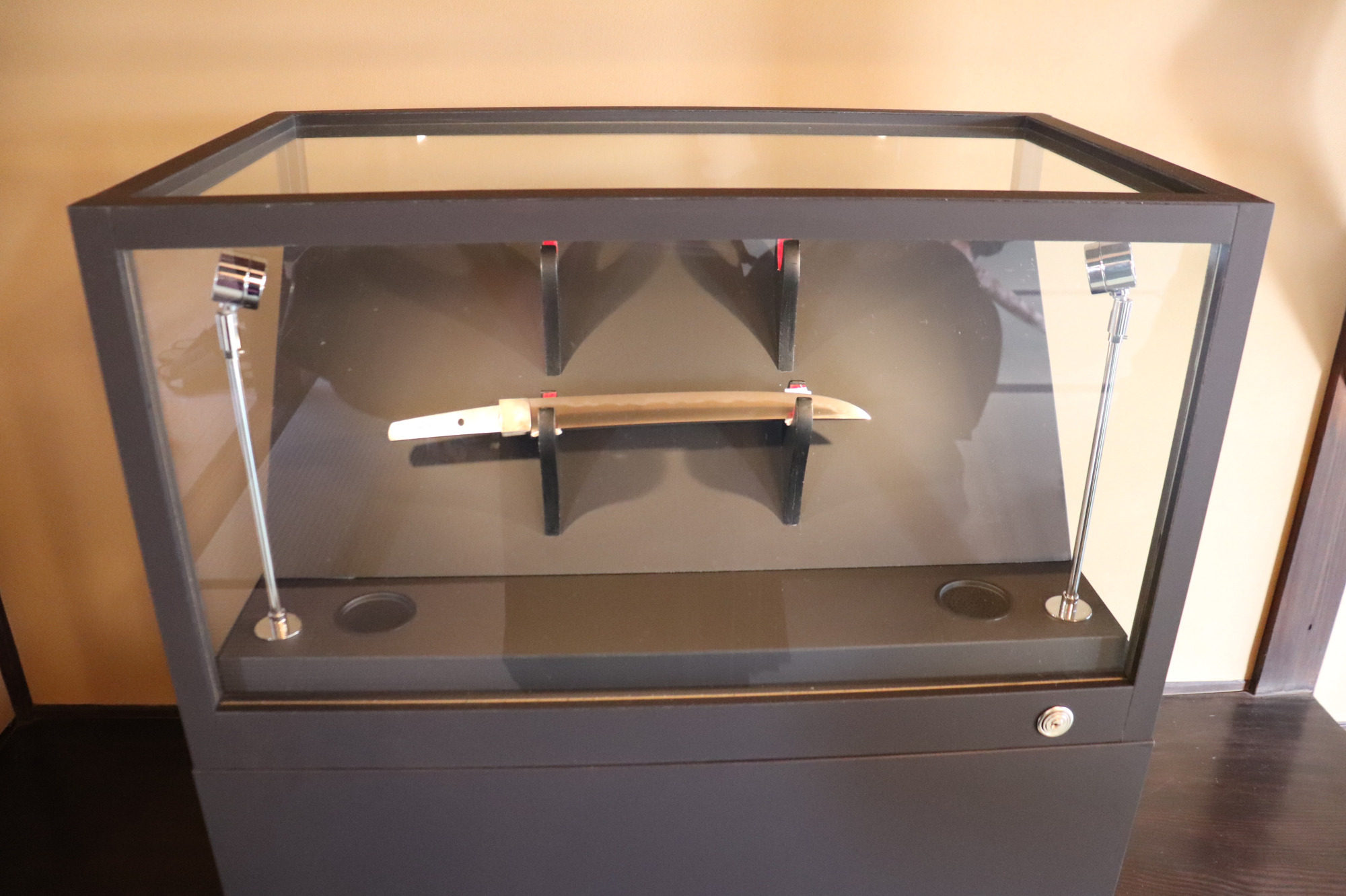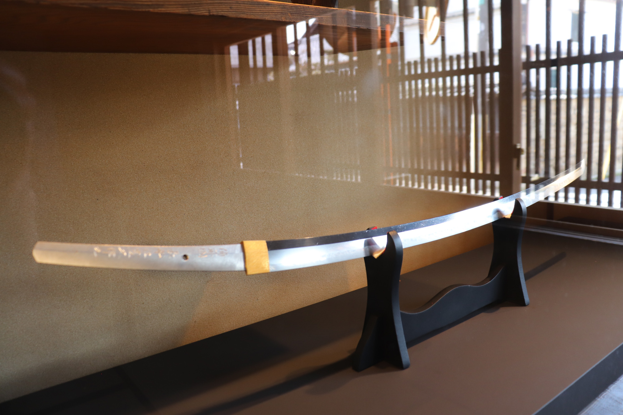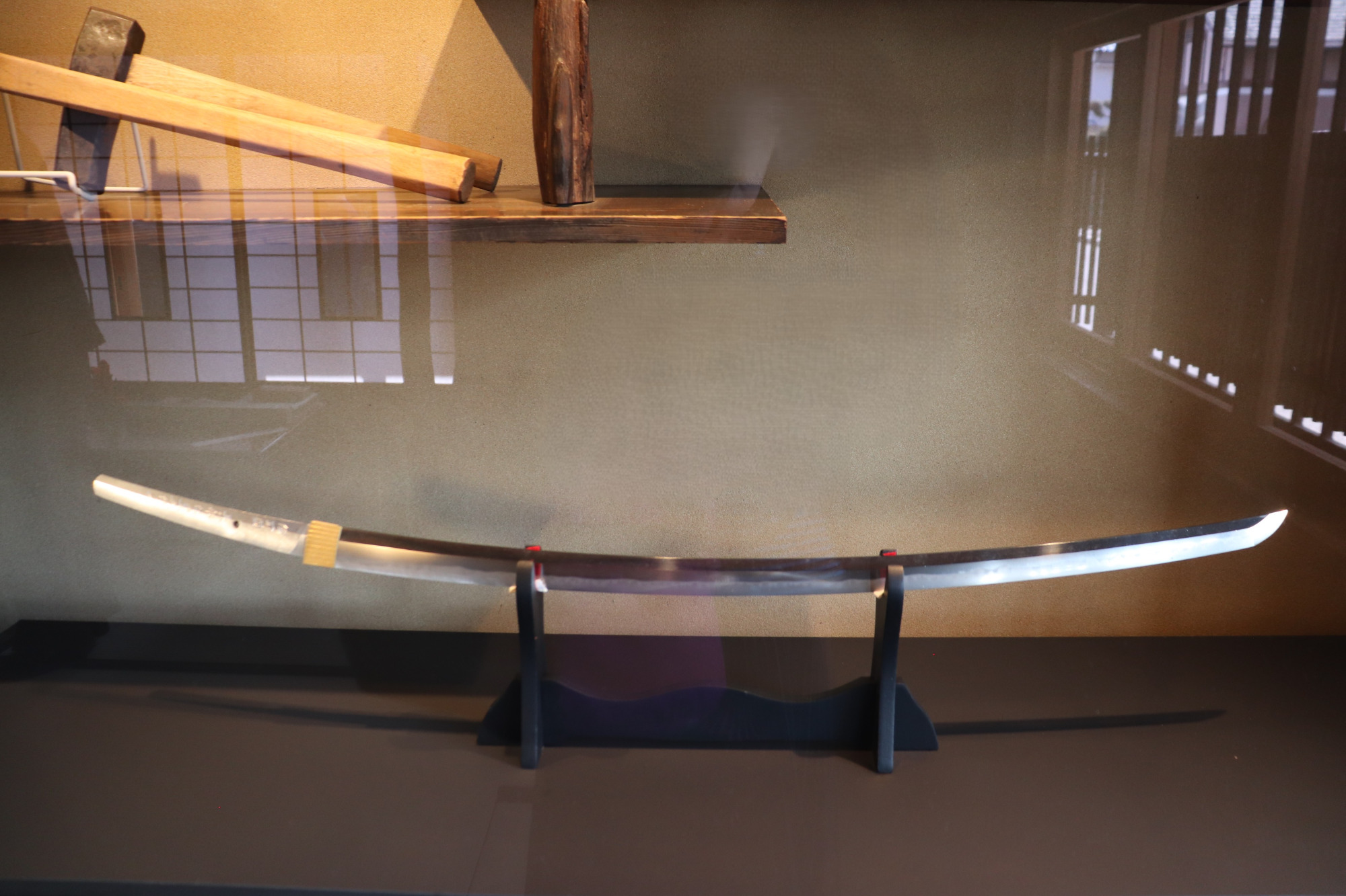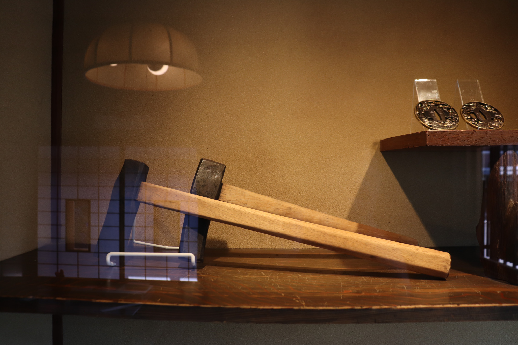 2階は宿泊者の寝室になります。寝床を守る御守刀として短刀がショーケースに置かれています。刀と同じ空間で一夜を過ごすことで、昔の人たちの日常生活に刀が身近な存在であったことを感じられます。