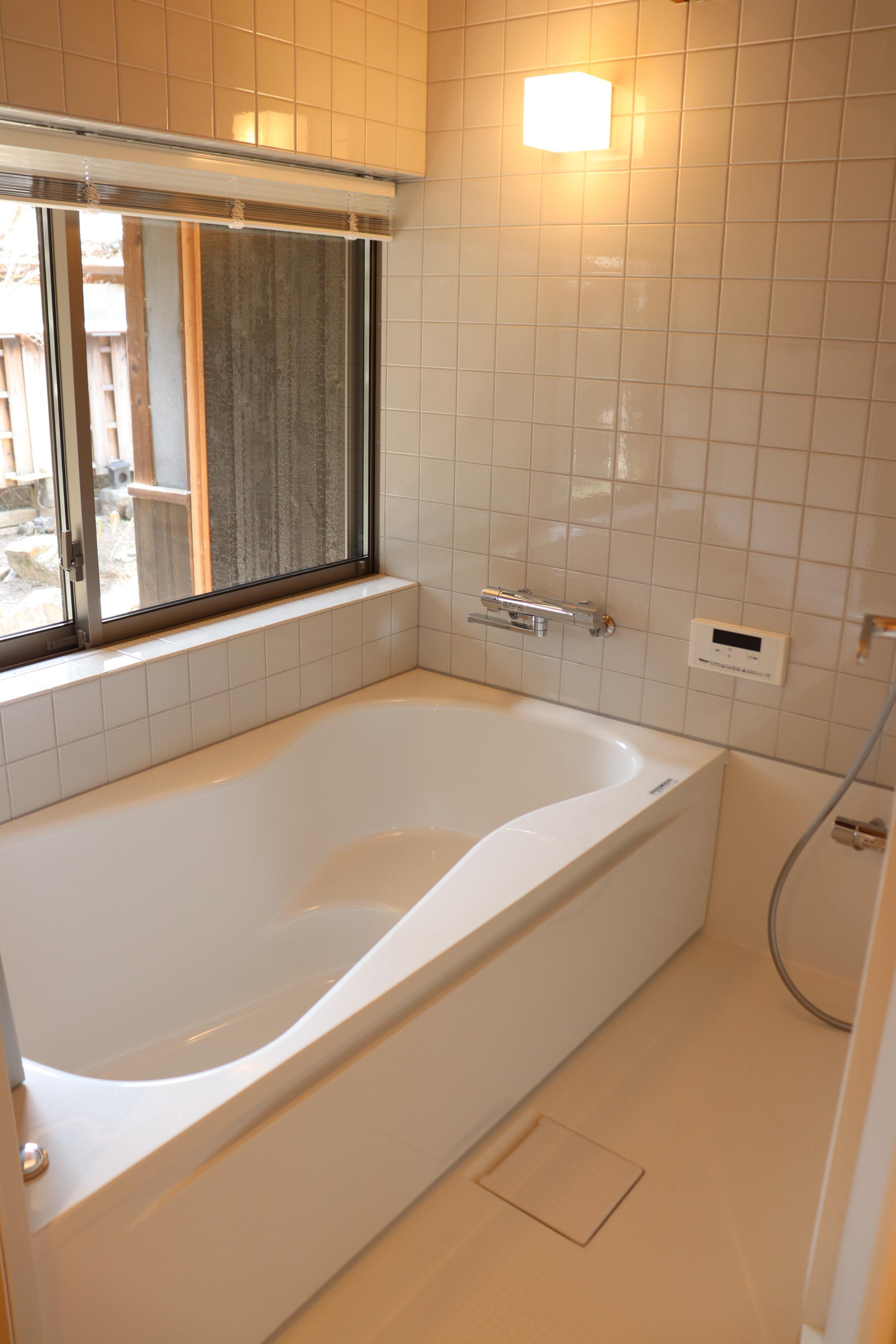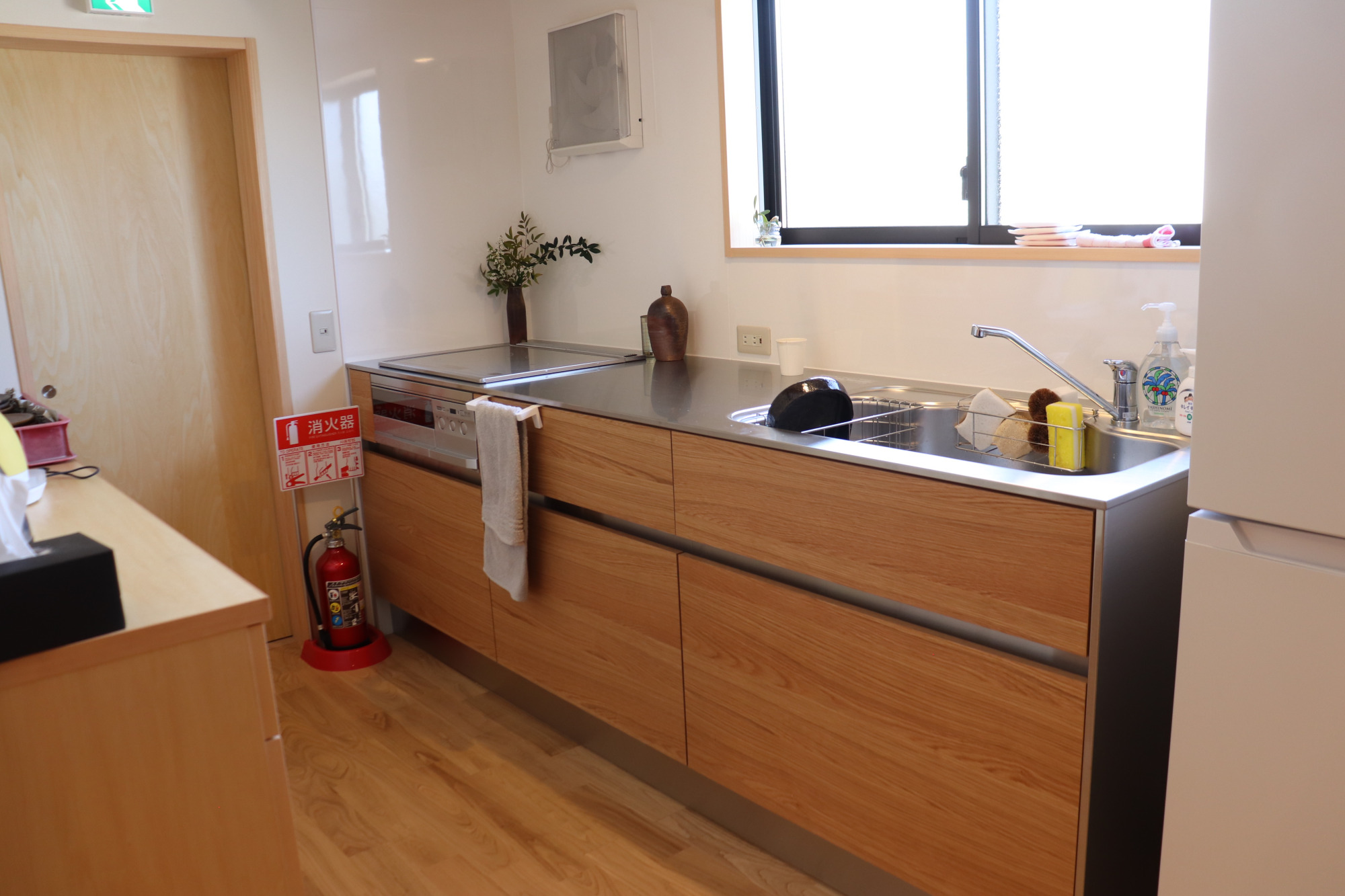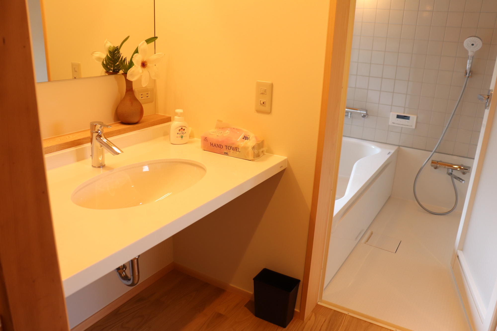 水回りは、1階にお風呂、洗面台、台所、トイレが備わっています。広いお風呂からは庭がよく見えます。台所では簡単な調理もできます。トイレと洗面台は2階にもあります。