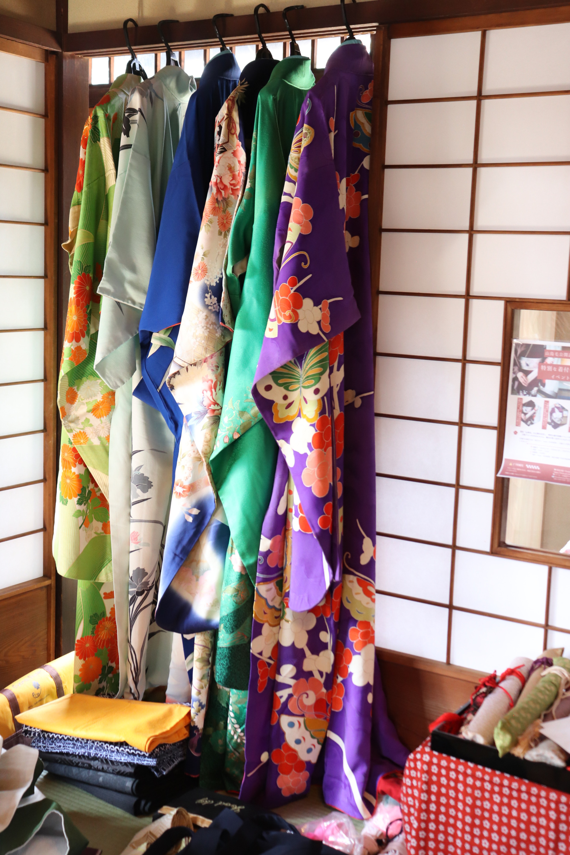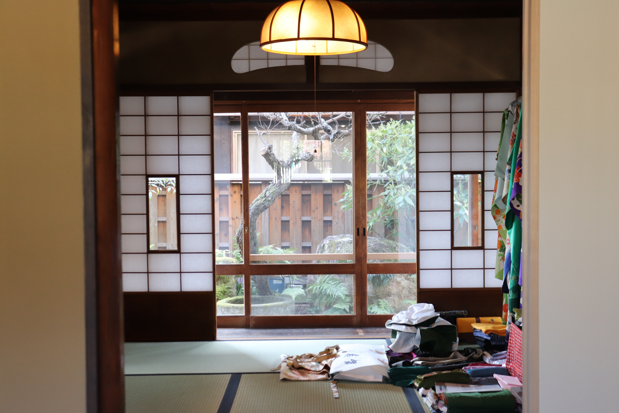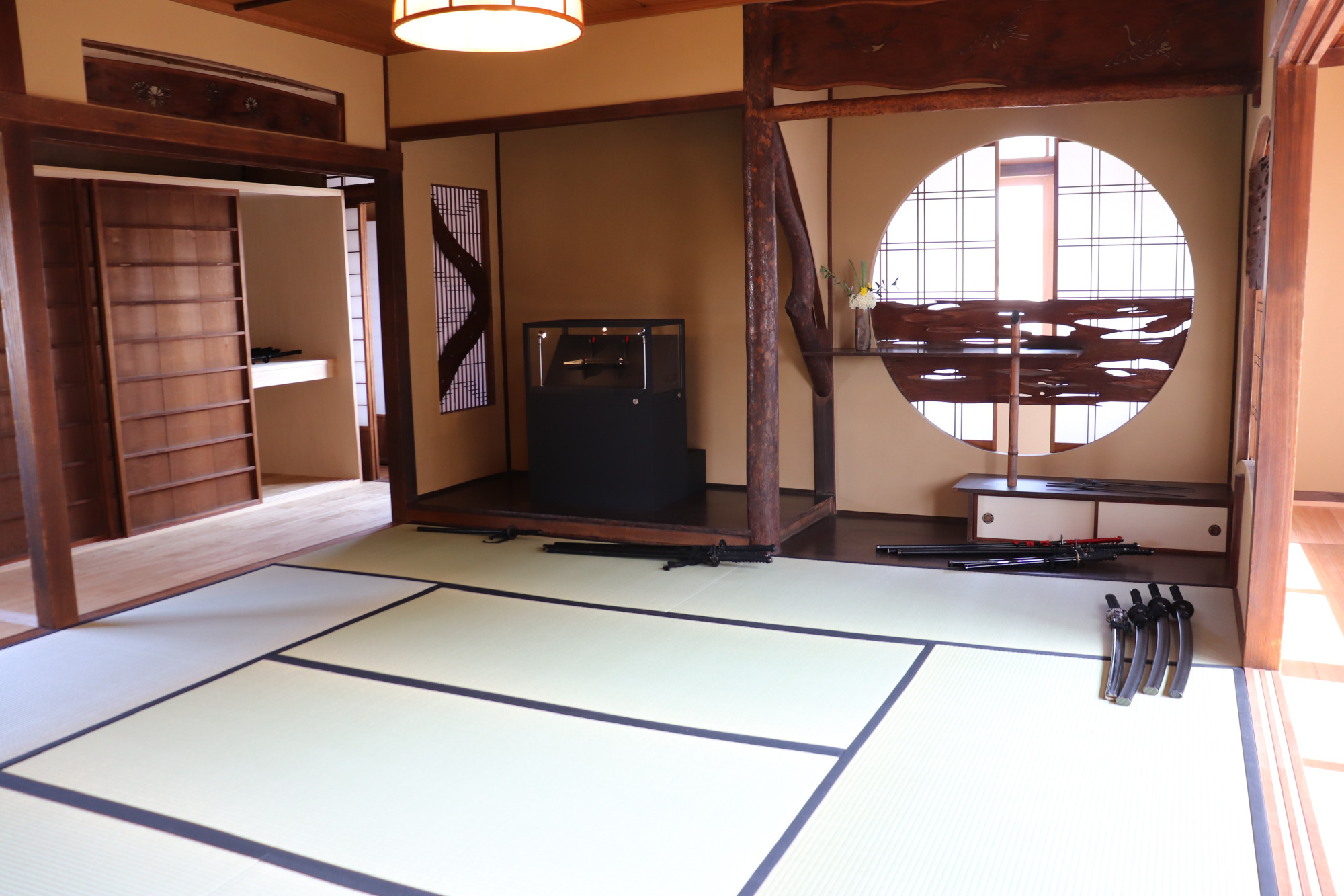 玄関を入ると続き間で3部屋があります。プレオープンの日は、着付けをして「刀を纏う」体験会と宿のお披露目会が行われていました。玄関を入ってすぐに目に入る飾り障子やお床のしつらえが季節を感じさせてくれました。刀の展示は、1階の和室の飾り棚にあります。