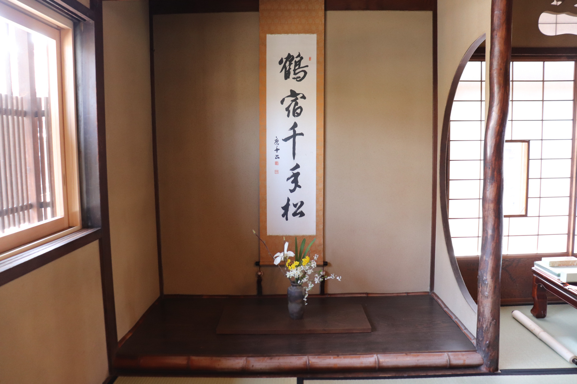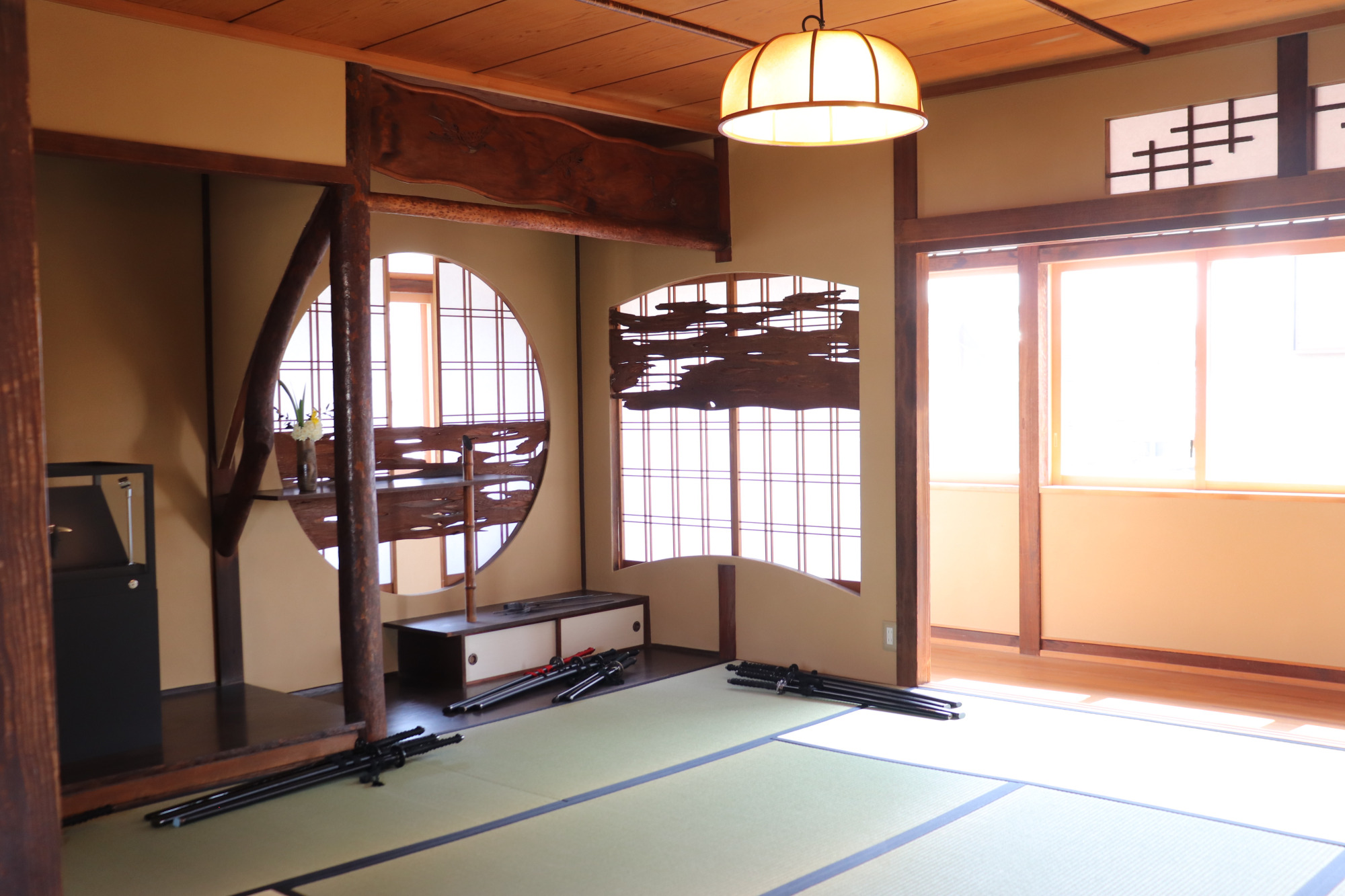 2階の和室は日当たりの良い明るい部屋です。囲むように廊下があるので柔らかい光が入ります。お床の円形の飾り障子を少し開けると、掛け軸のようにも見えます。その隙間からのぞくと「仲﨑邸」が見えるようになっている、よく考えられた意匠設計です。