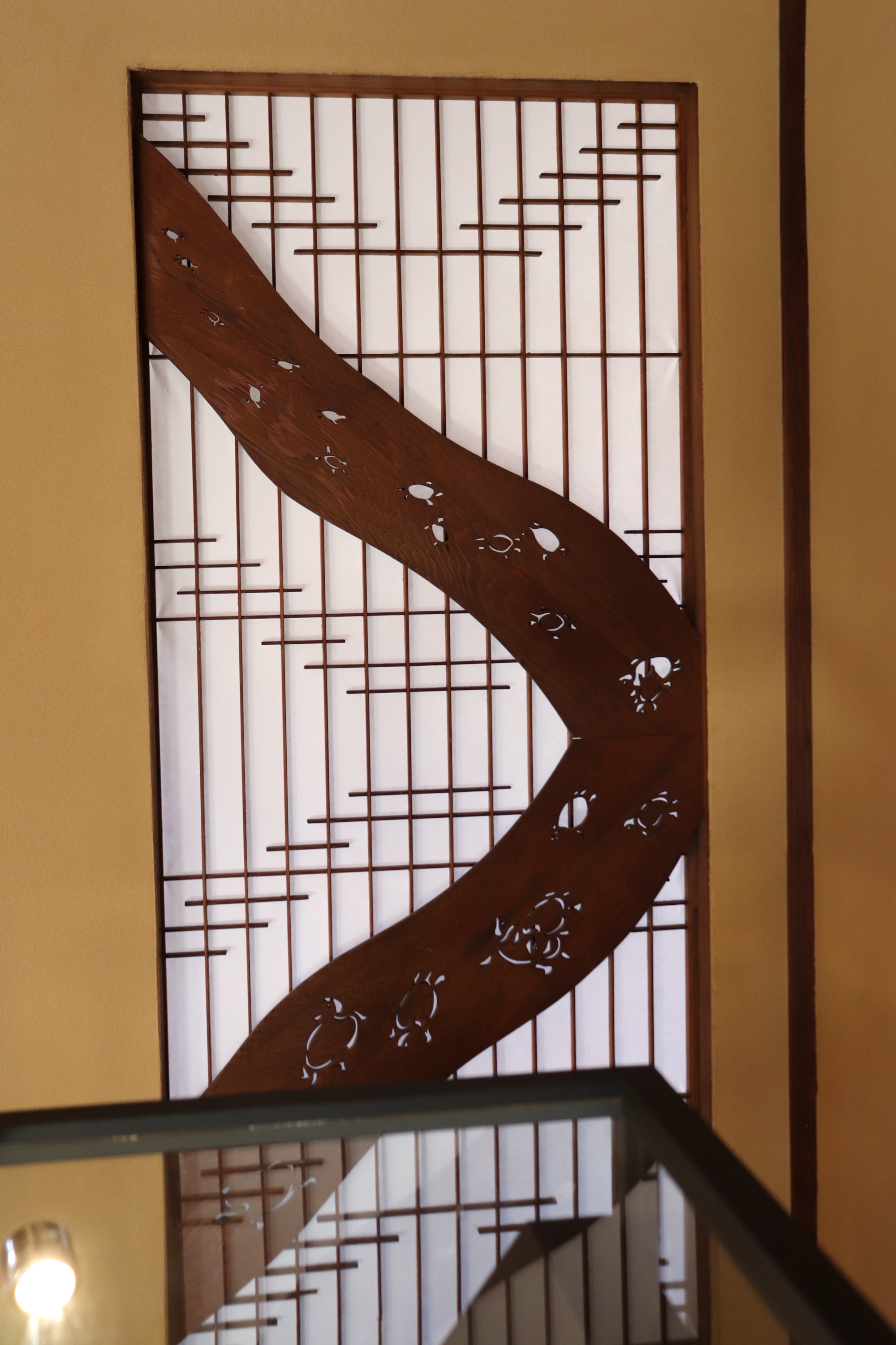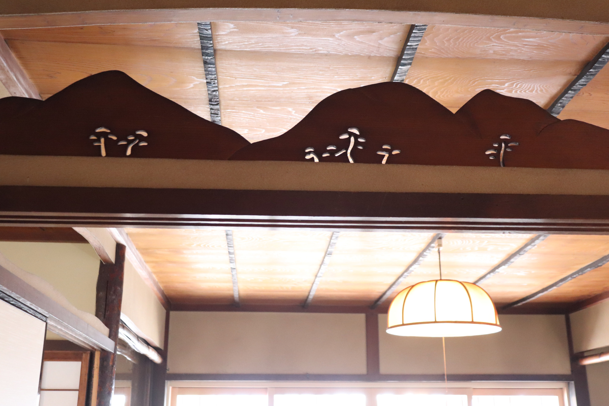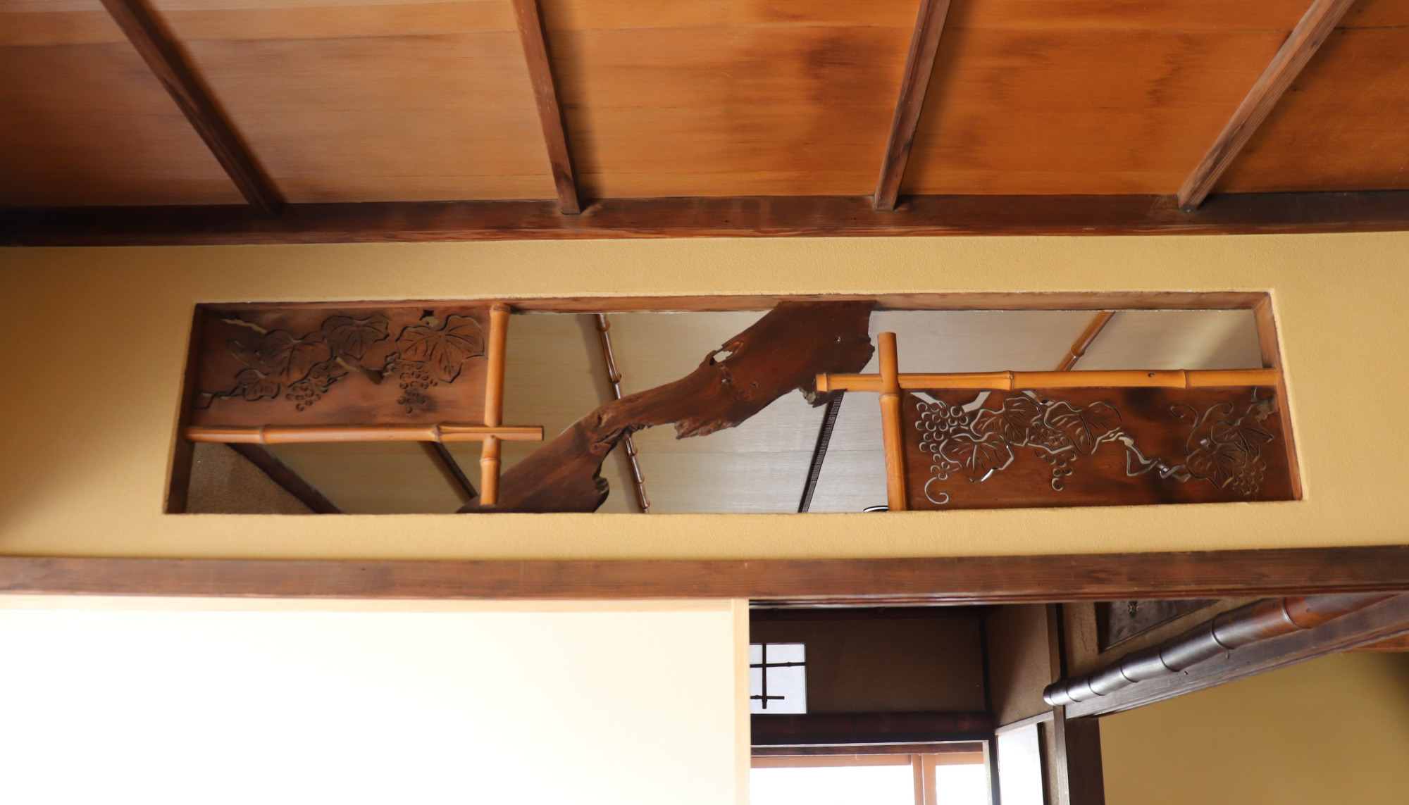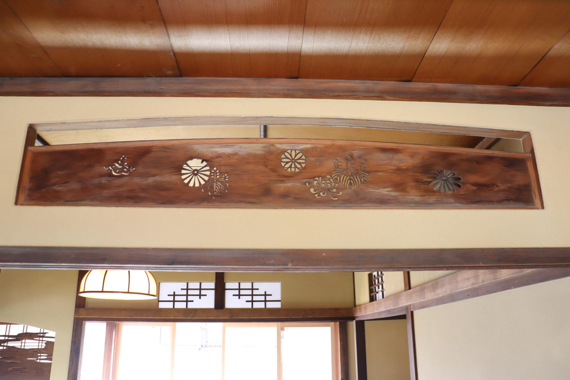和室の各所に見られる欄間の装飾が目を引きました。菊、亀、葡萄など、意匠の繊細さと職人の技が伝わってきます。