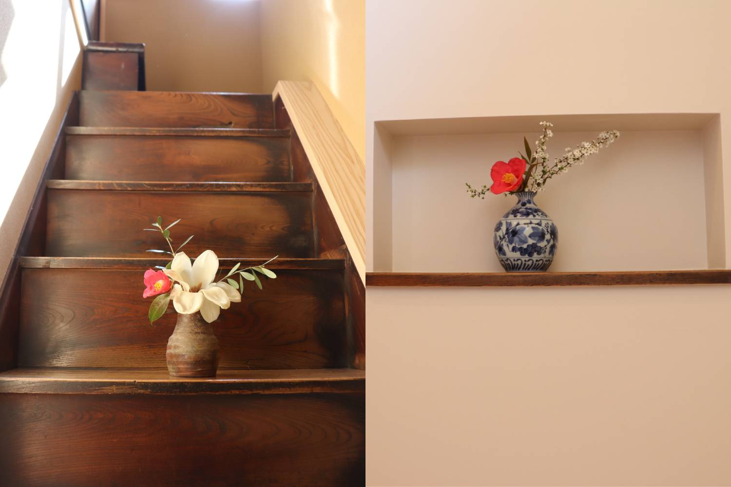 昔階段だった場所は、素敵な飾り棚になっていました。階段の壁にも飾り棚があります。季節の椿が生けられていて素敵でした。