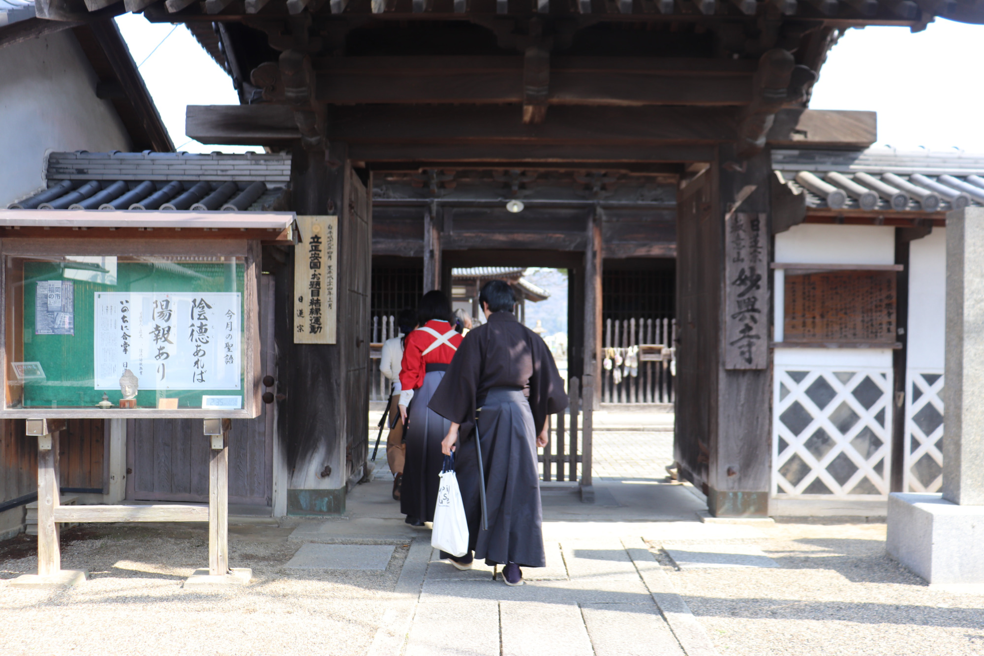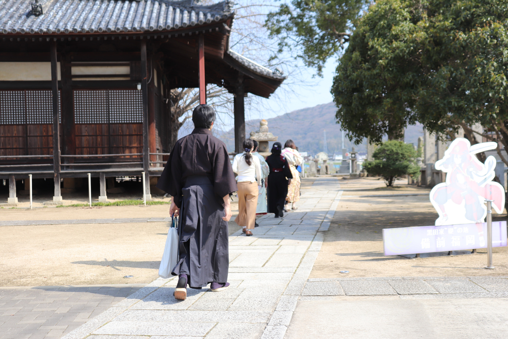 この日は「seppa」から歩いて約3分の所にある「教意山妙興寺」に移動して、殺陣の体験も実施されました。ここは日蓮宗のお寺で鬼子母神が祀られています。隣接の墓地には、宇喜多興家(おきいえ)と黒田官兵衛孝高(如水)の曽祖父・高政のものと伝えられる墓石もあります。宿にお泊りの際には散策にもおすすめです。はかまに刀を差して歩くと歩き方も変わり、町歩きも様になっていました。