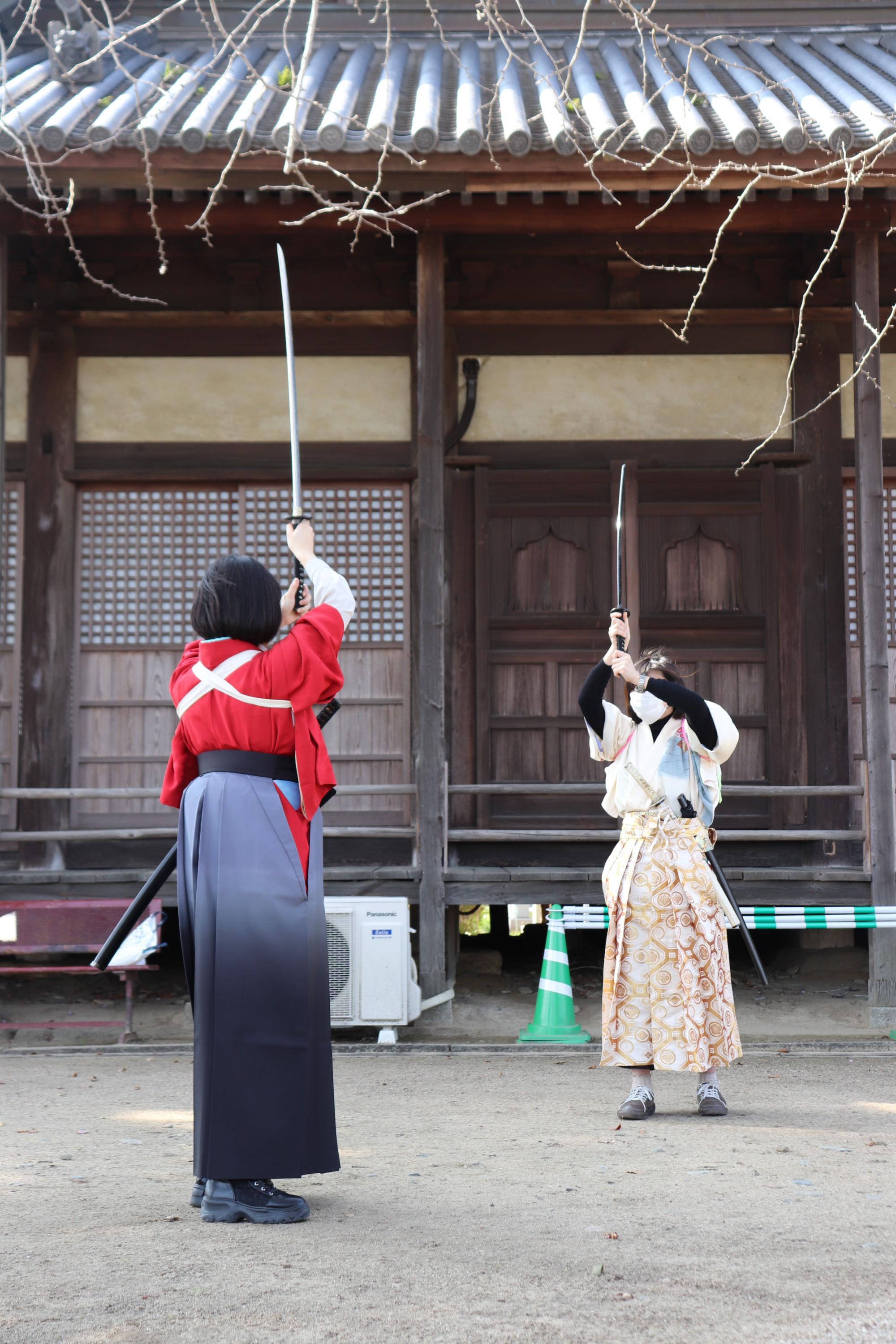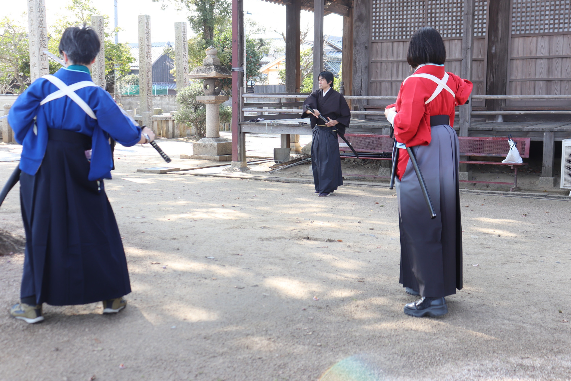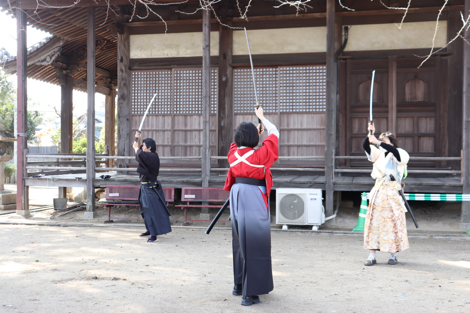 屋外での実際の殺陣体験、皆さん真剣でした!大きなイチョウの木の下で刀を抜く所作から始まり、少しずつ刀を振って重さや大きさに慣れていきました。お寺の境内なので、雰囲気も抜群です。