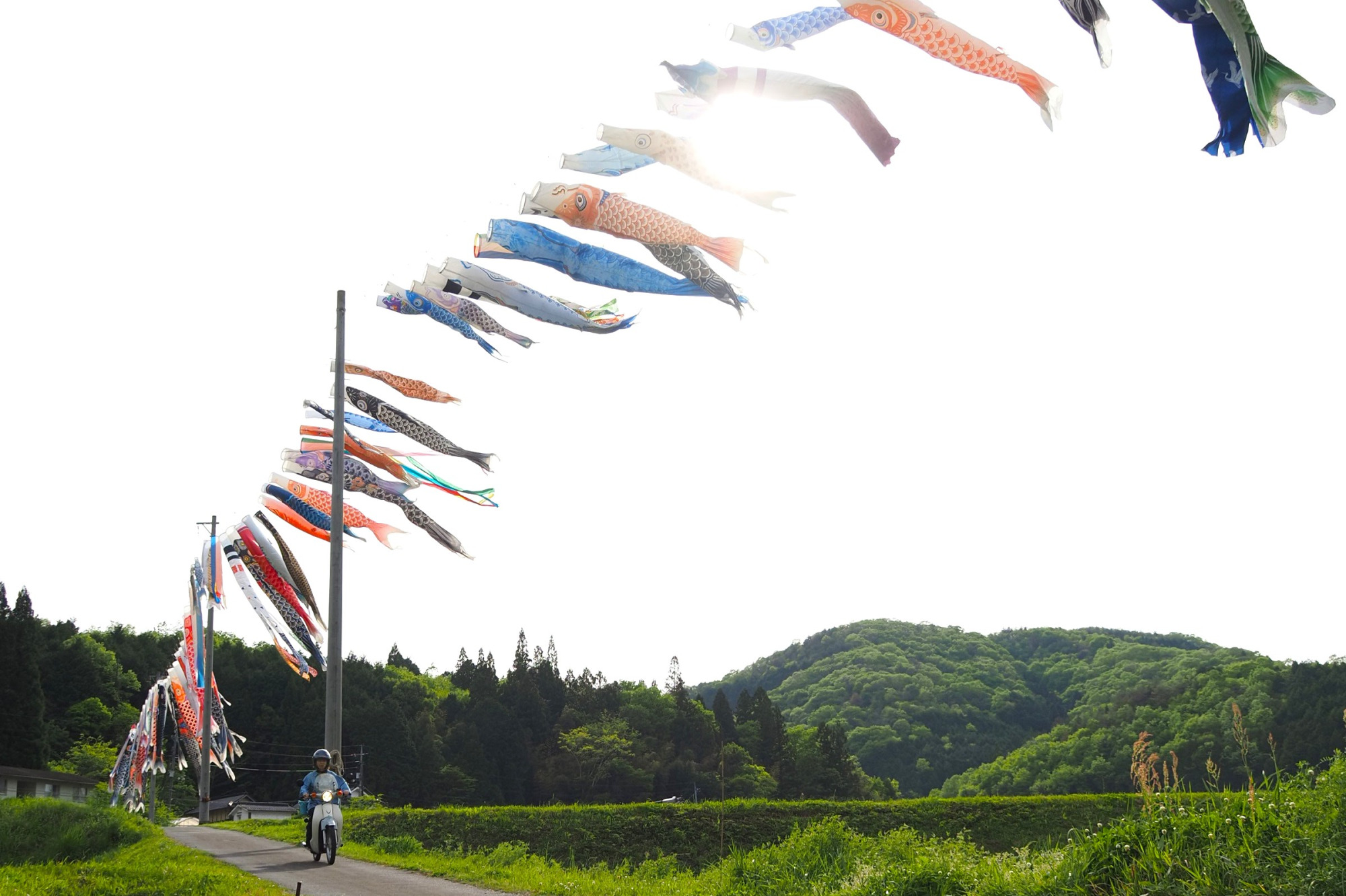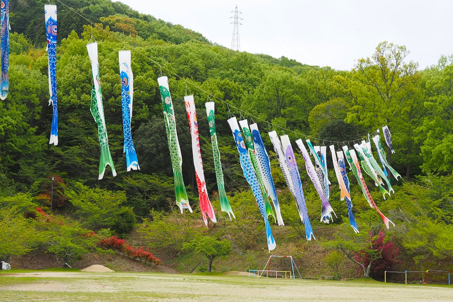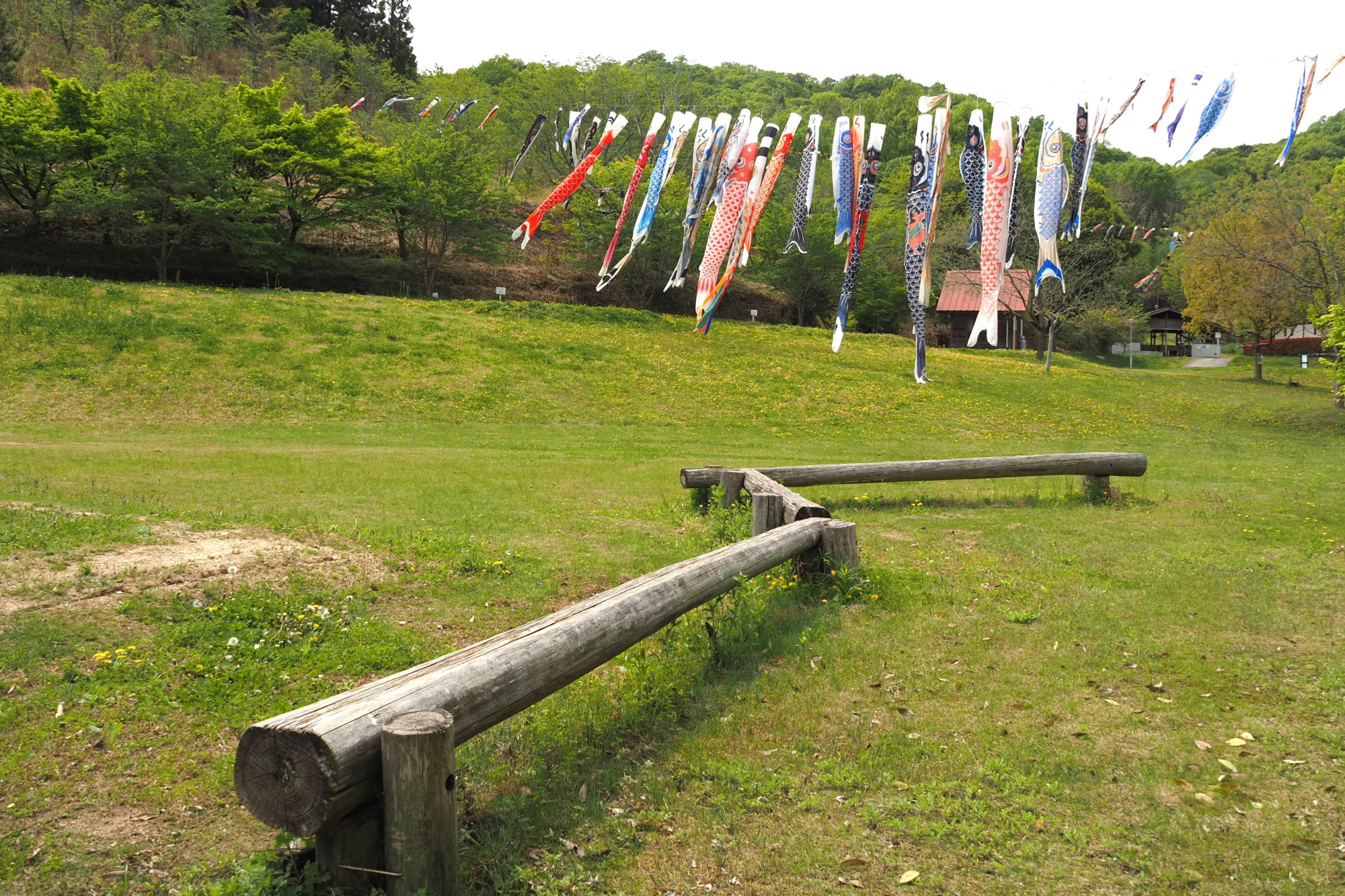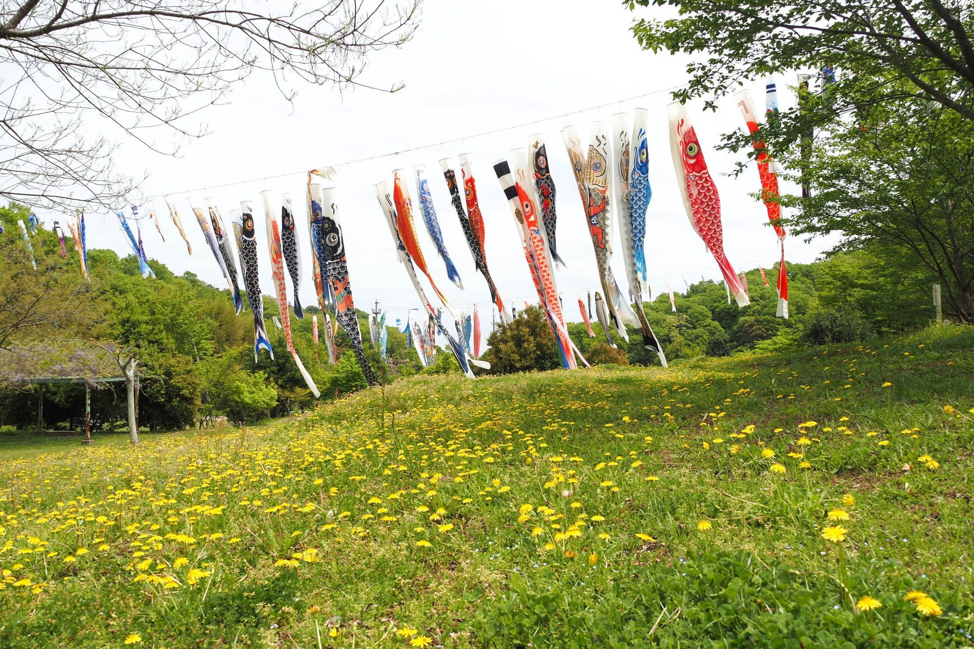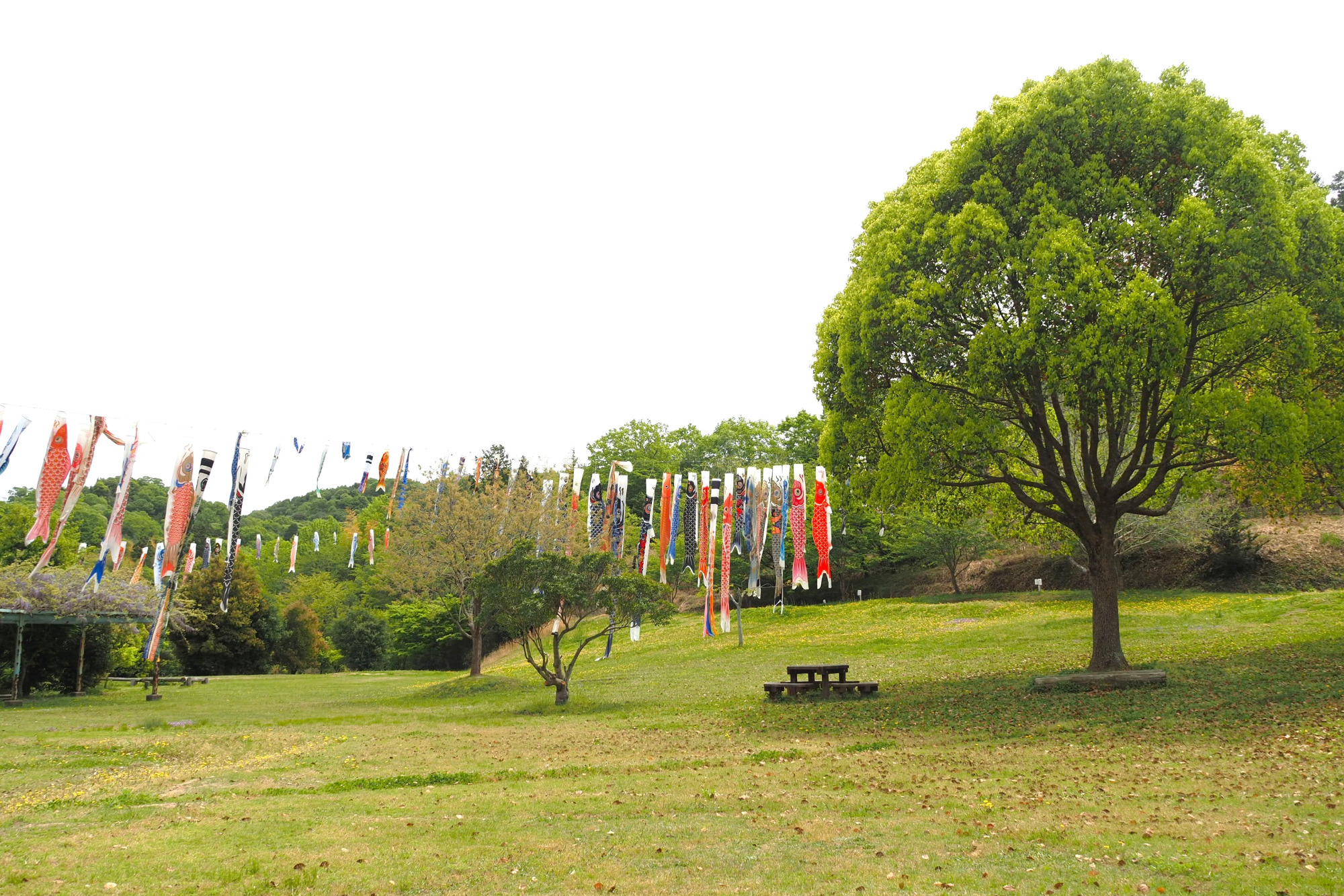 細い山道を進むと、突然景色が開け、美しい芝生広場が。その上空にたくさんのこいのぼりが泳いでいました。