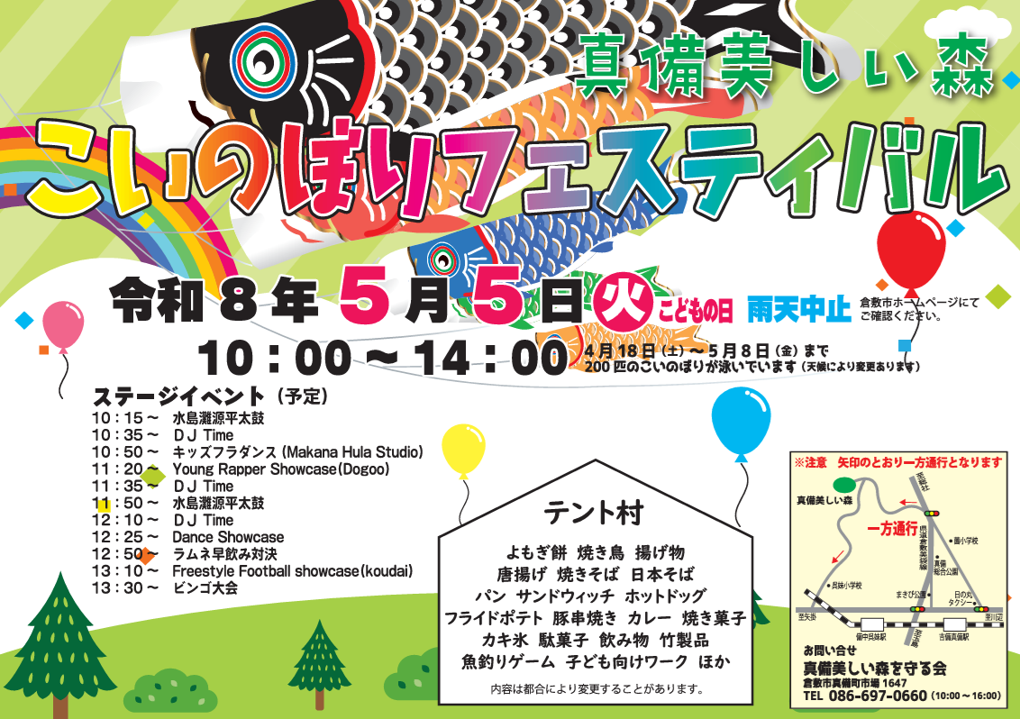 豊かな自然に囲まれた「真備美しい森」は、キャンプサイトやバンガロー、遊歩道や遊具、舞台芸術棟などを備えた施設です。毎年ゴールデンウィークを中心にこいのぼりが飾られます。