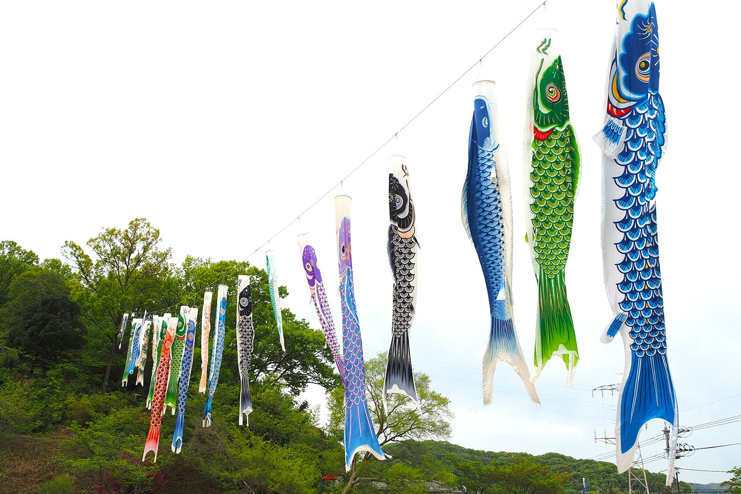 川の両岸に渡されたワイヤーから吊るされた40匹以上のこいのぼりがたなびく姿は圧巻!ぎゅっと密になって泳いでおり、迫力を感じます。