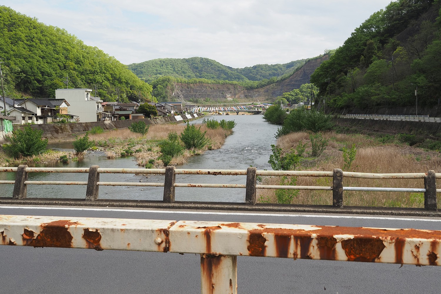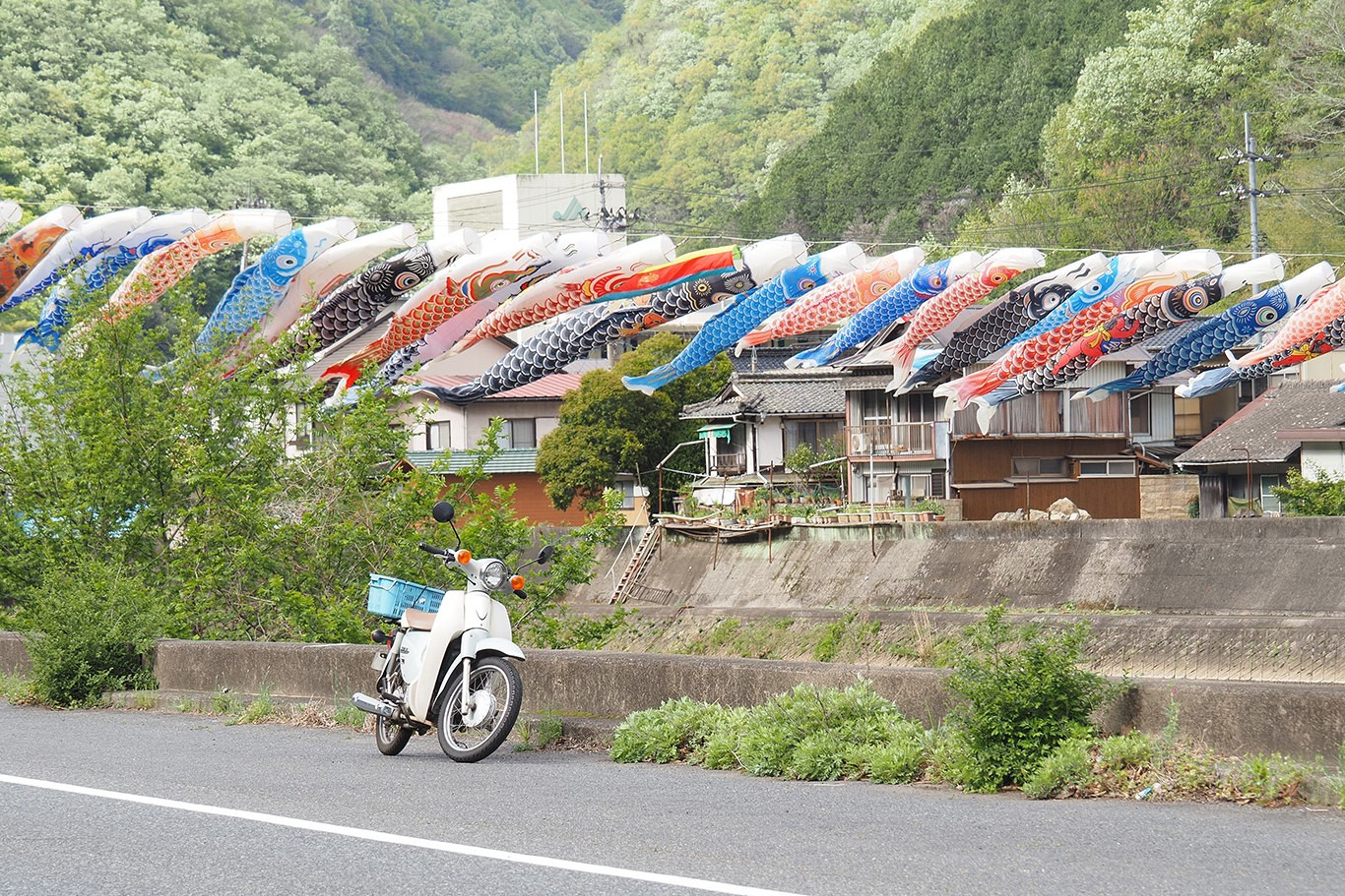 新見市哲多町を流れる本郷川でも、ゴールデンウィークの短い期間だけ特別な景色に出会えます。川をまたぐようにして飾られるこいのぼりは、至近距離で見ることができて大迫力。とても感動しました。