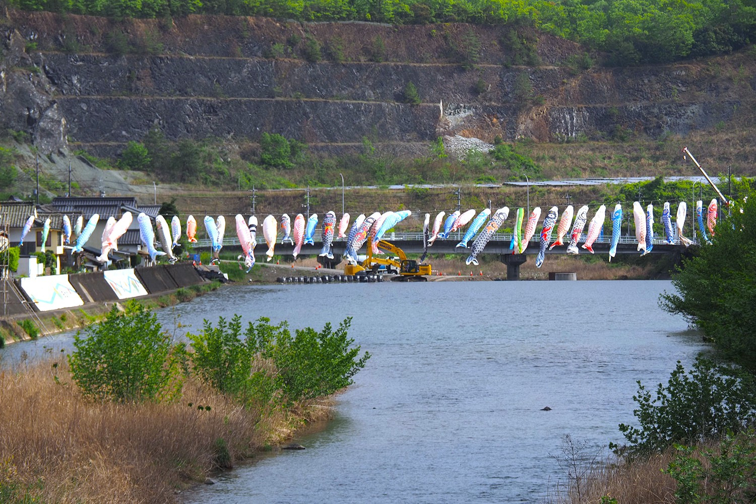 旭川ダム湖へと注ぐ通谷川(かいだにがわ)で見られるのは、川を横断する迫力満点のこいのぼり。
