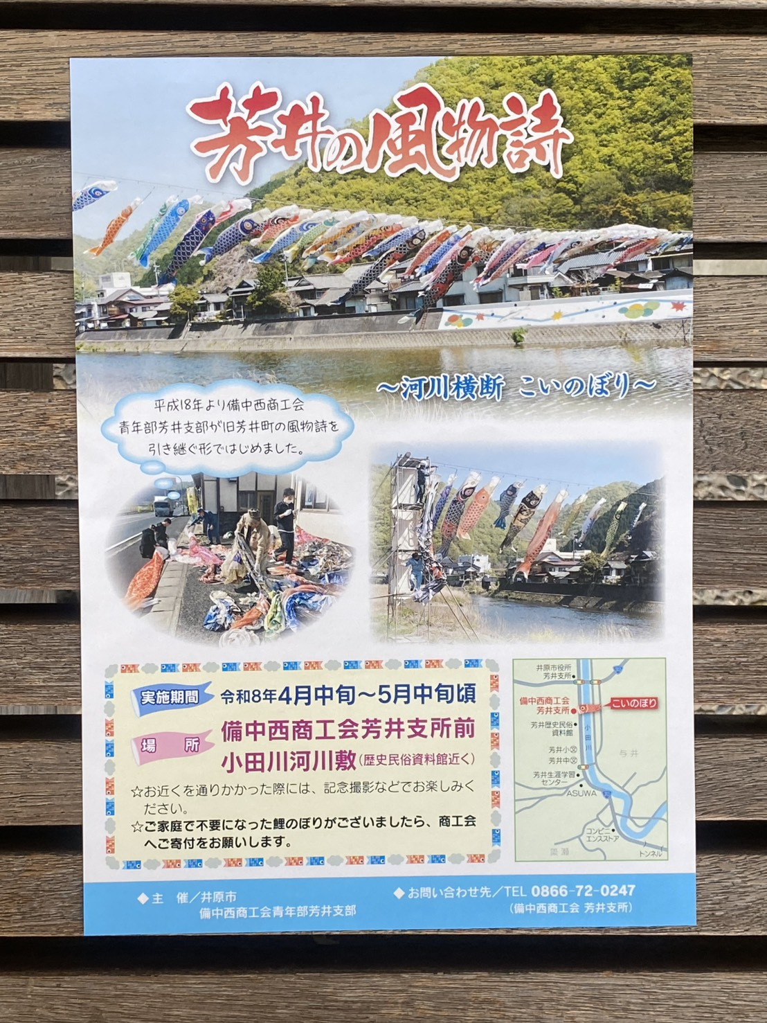 2006年から備中西商工会青年部吉井支部が、旧芳井町の風物詩を引き継ぐ形で始まりました。家庭で不要になった鯉のぼりの寄付も募っています。