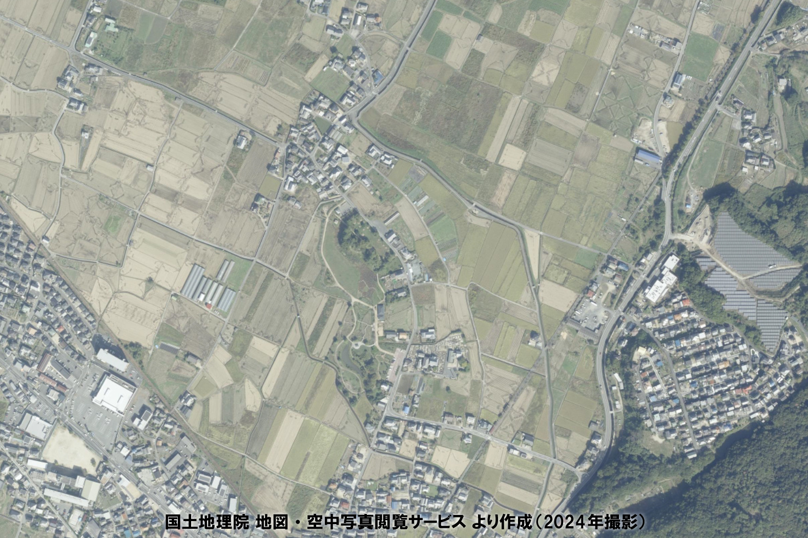 空から見た「備中高松城」の現在の様子です。中央に見えている木立のあるエリアが本丸跡です。城跡の中心をなす本丸、二の丸、三の丸を道路が縦断しているうえに、もともと周囲からわずかに標高が高くなっている程度の遺構なので、現地へ行ってもどこからどこまでが城跡なのか正直なところよくわかりません…。