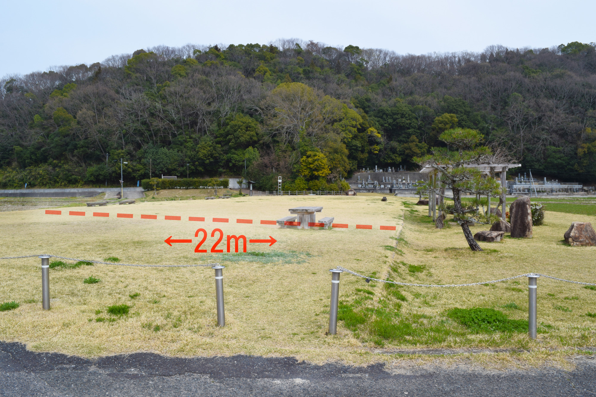 残された堤防は一部削られてしまっているようですが、それでもはっきりと堤防だと分かる姿をとどめています。また、発掘調査によって基底部が確認されており、堤防の断面を台形に見立てると、底辺の幅は約22メートル、上辺の幅は約11メートル、高さは約7メートルもあったと考えられています。想像以上に大きな構造物で、これを12日間で完成させたというのは驚異的です。秀吉は領民に対して、土俵ひとつにつきコメ1升と銭100文を与えることで、それを可能にしたと言われています。