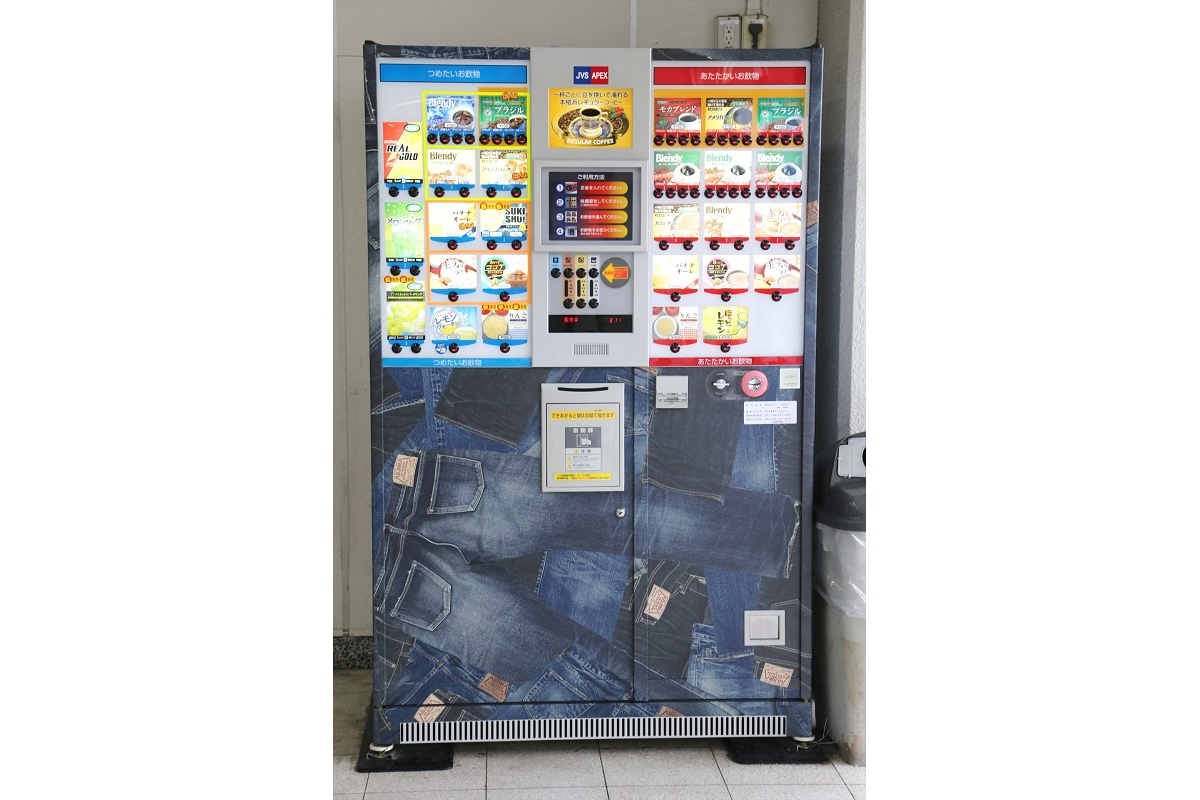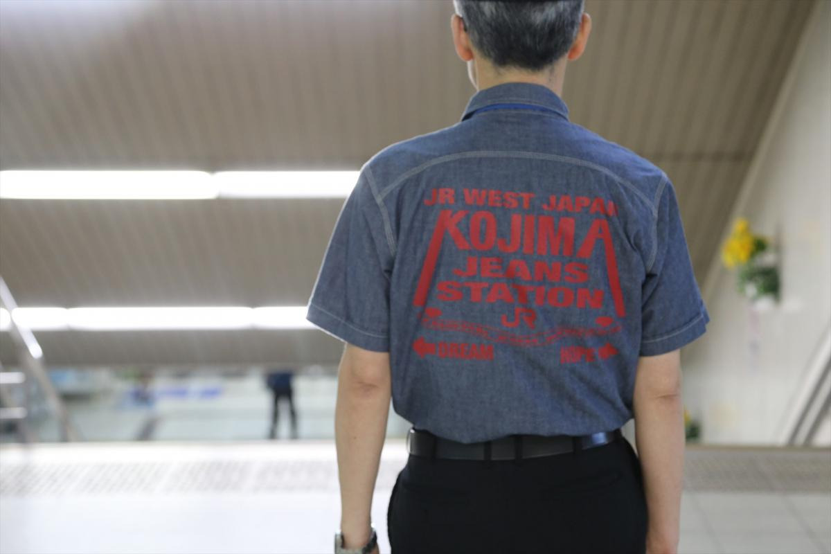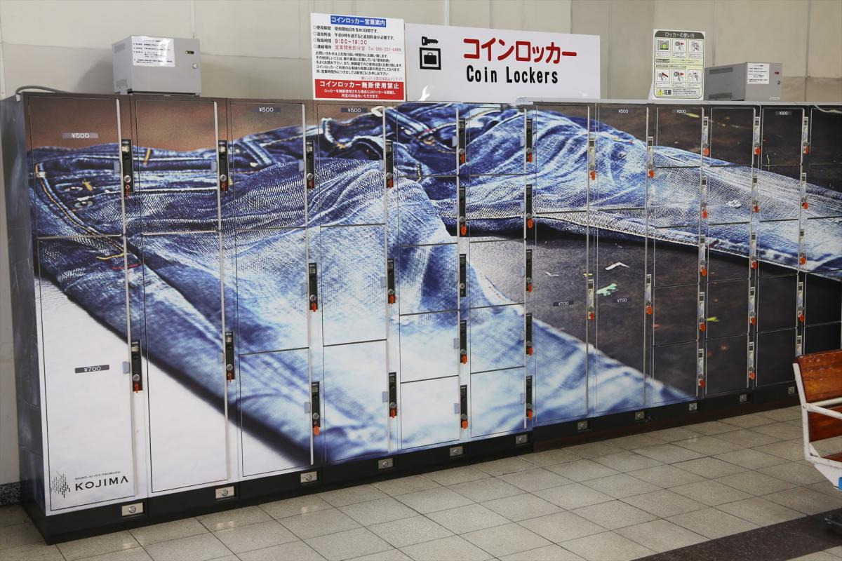 玄関口のJR児島駅は、駅名標に自動販売機、改札、階段、ありとあらゆるところにジーンズモチーフが配されています。