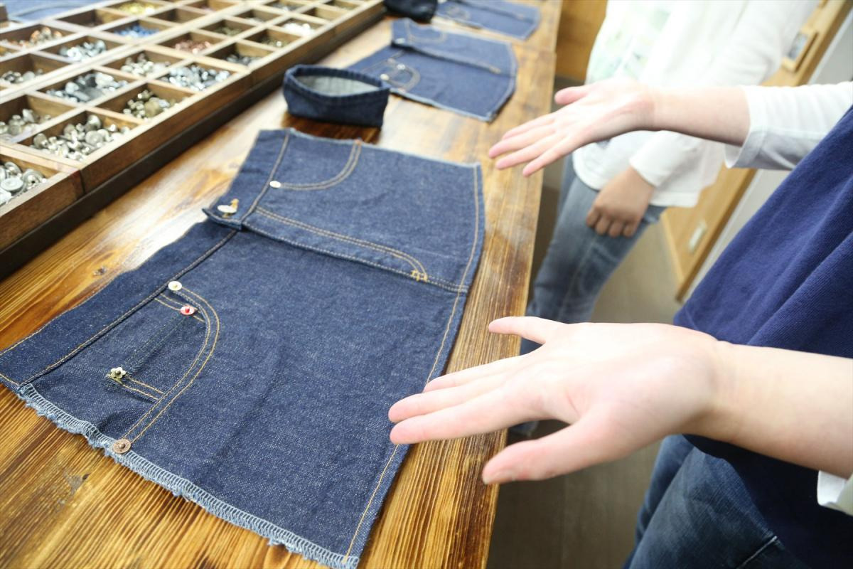 体験工場では、まず素材となるジーンズの中から自分に合ったサイズを選びます。腰に当てたとき横幅がぴったり合うかどうかが、適切なサイズを見極めるコツです。