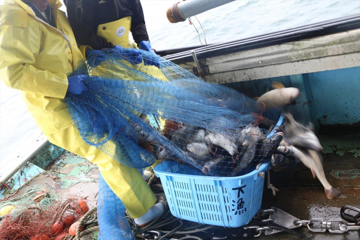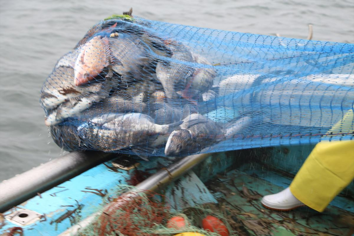 引き上げてみると……網の底には活きの良い鯛がびっちり!