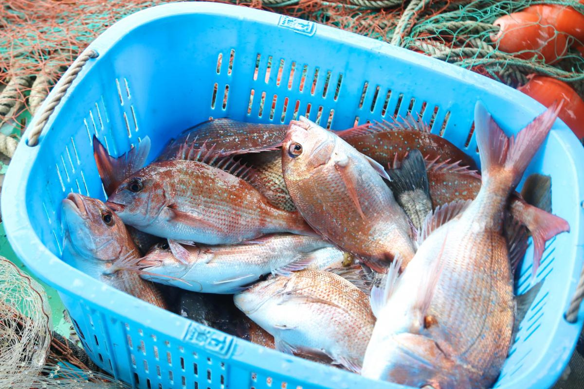 鯛がかかった網を全て船上に引き揚げたら、縛っていた網籠の底部分をほどき、収穫した魚を運搬用の籠に解放し、船内のいけすまで運びます。わずか15分という短時間の漁なので、魚を弱らせることなく生きた新鮮な状態のまま、陸まで鯛を持ち帰ることができるのです。