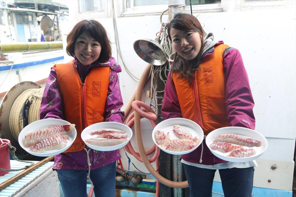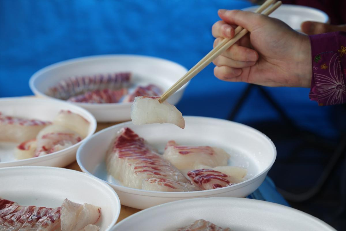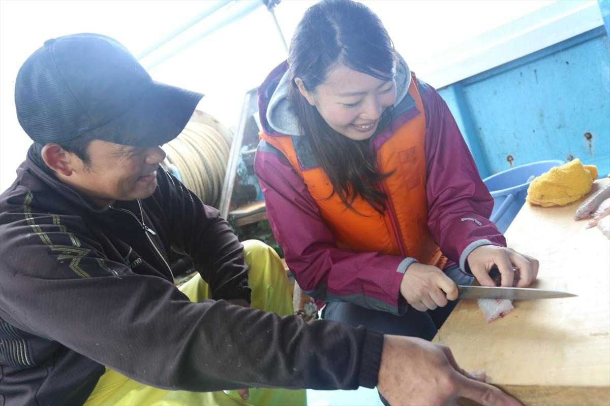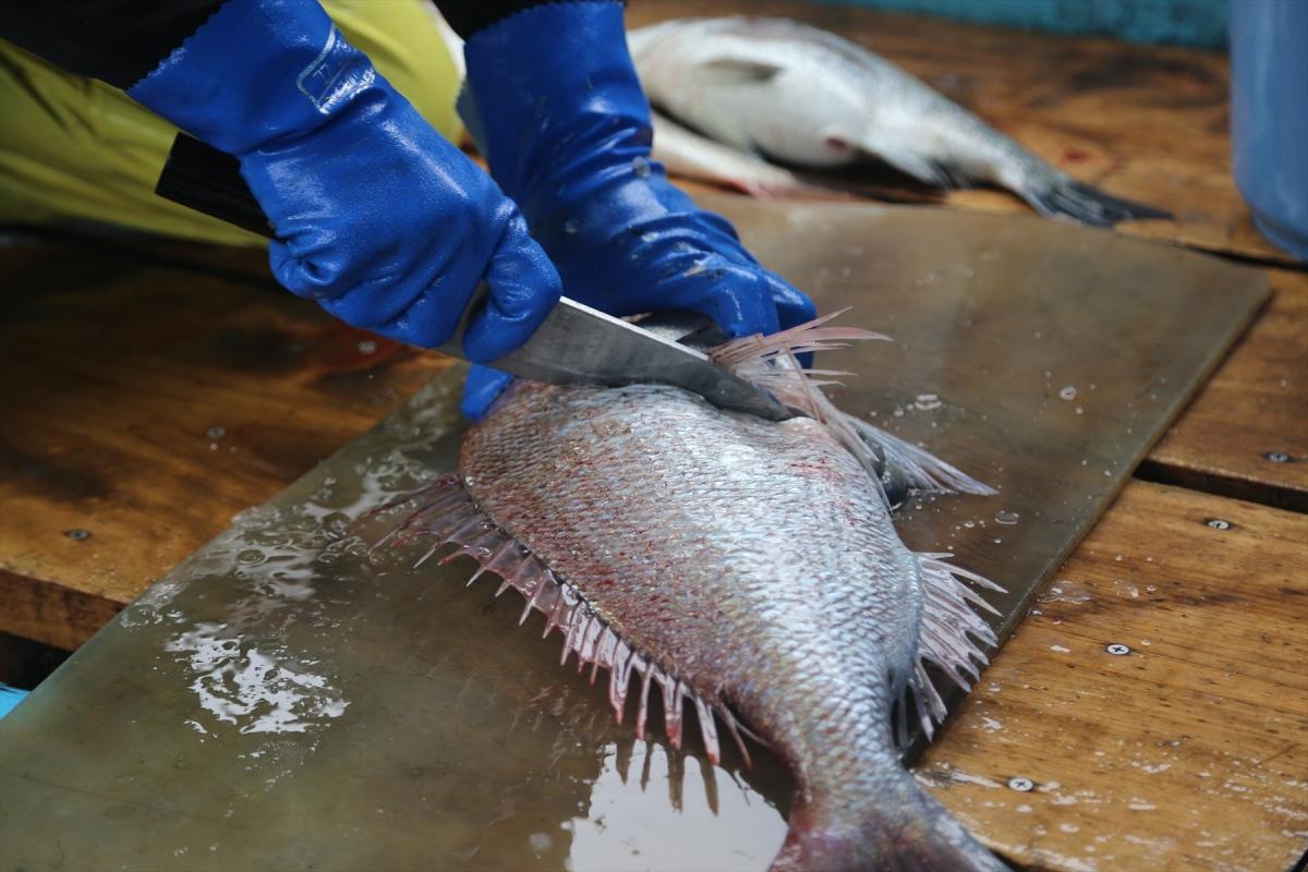 帰路につく前に、なんと獲れたての鯛を漁師さんがその場で捌いて、お刺身にしてくれるとのこと!体長40〜50cmほどの真鯛と、黒鯛(チヌ)、一緒に獲れたニベを捌いて食べ比べることに。私も包丁を握り、鯛の身を三枚おろしの状態からお刺身のサイズに切り分ける体験をしました。