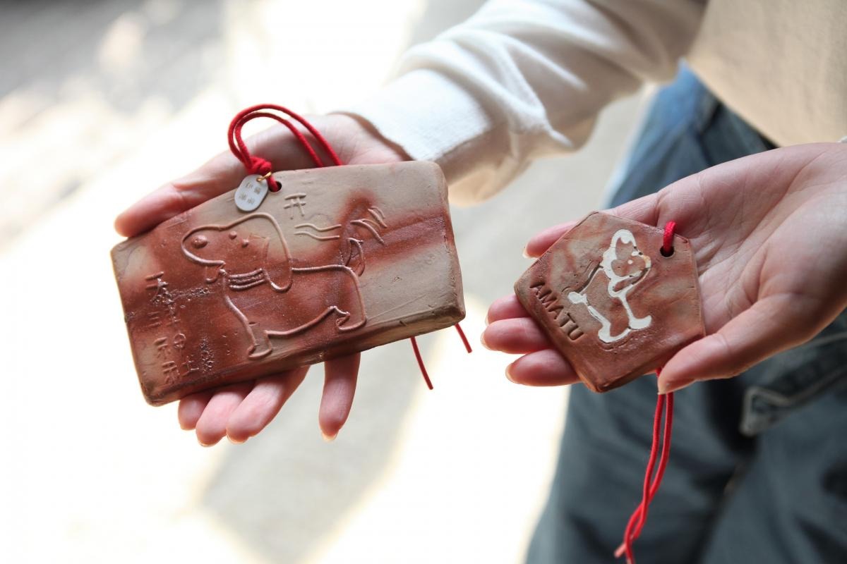 この町の特徴は、何といっても、登り窯の煙突が建ち並ぶ風景。焼き物の町の雰囲気があちこちに漂います。手頃なお値段のお店から、高級そうな大きな作品が飾ってある工房まで、見ているだけで楽しめます。散策中のお勧めは天津神社。なんと、備前焼の狛犬がいます!神社の瓦も参道も備前焼。絵馬まで備前焼でした。