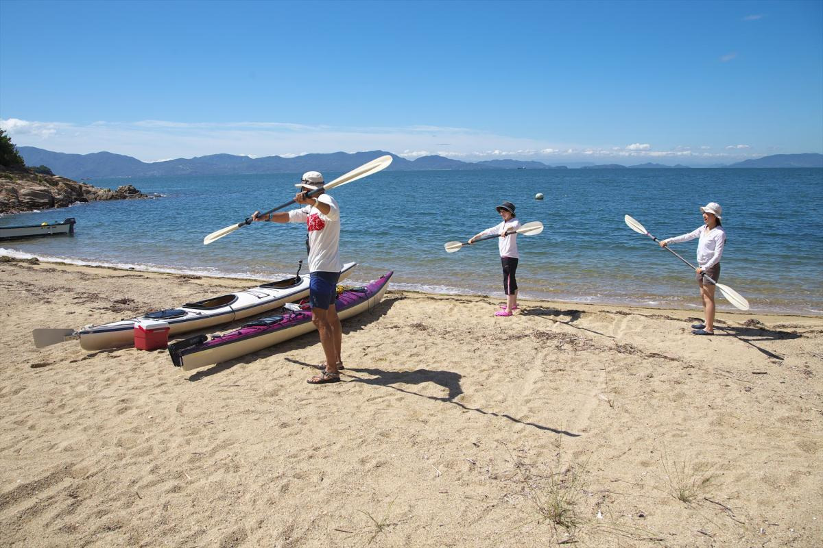 浜辺に着くと、早速海に出る準備をし、船への乗り込み方、パドルの持ち方、舵の操縦の仕方(※後席のみ)のレクチャーを受けます。