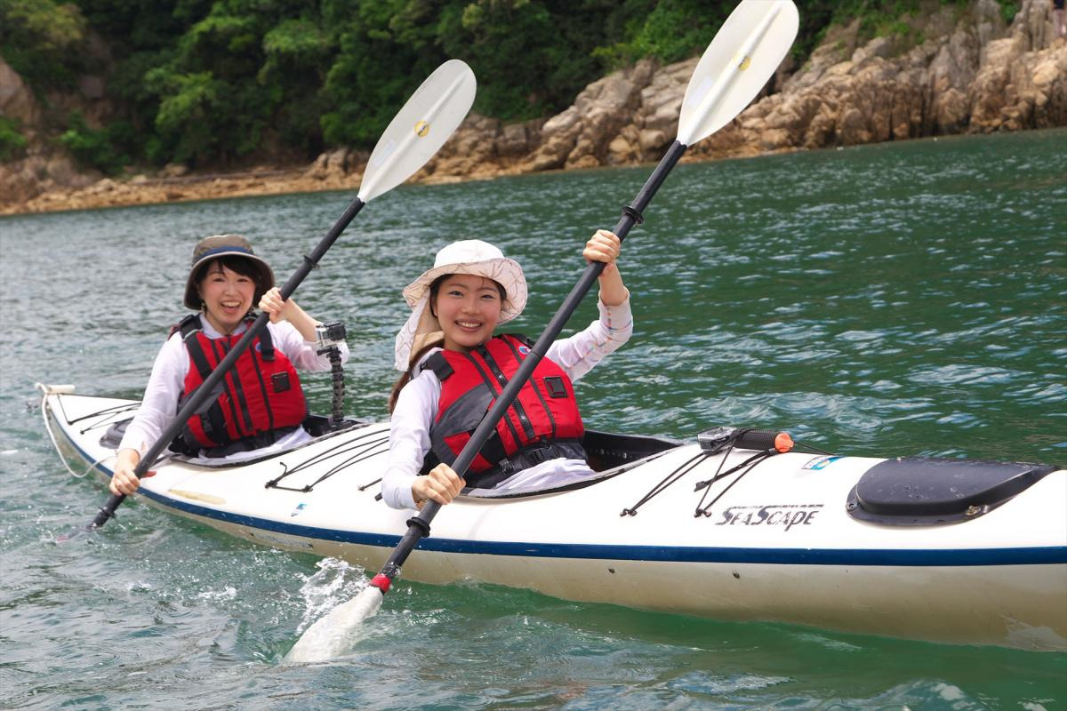 大海に自らの身と船一つで漕ぎ出すというワクワクあり、鍛え上げられるような全身運動ありのシーカヤック。辺りを遮るものが何もない開放感、島と空に包まれて波間を漂う心地よさは格別です!