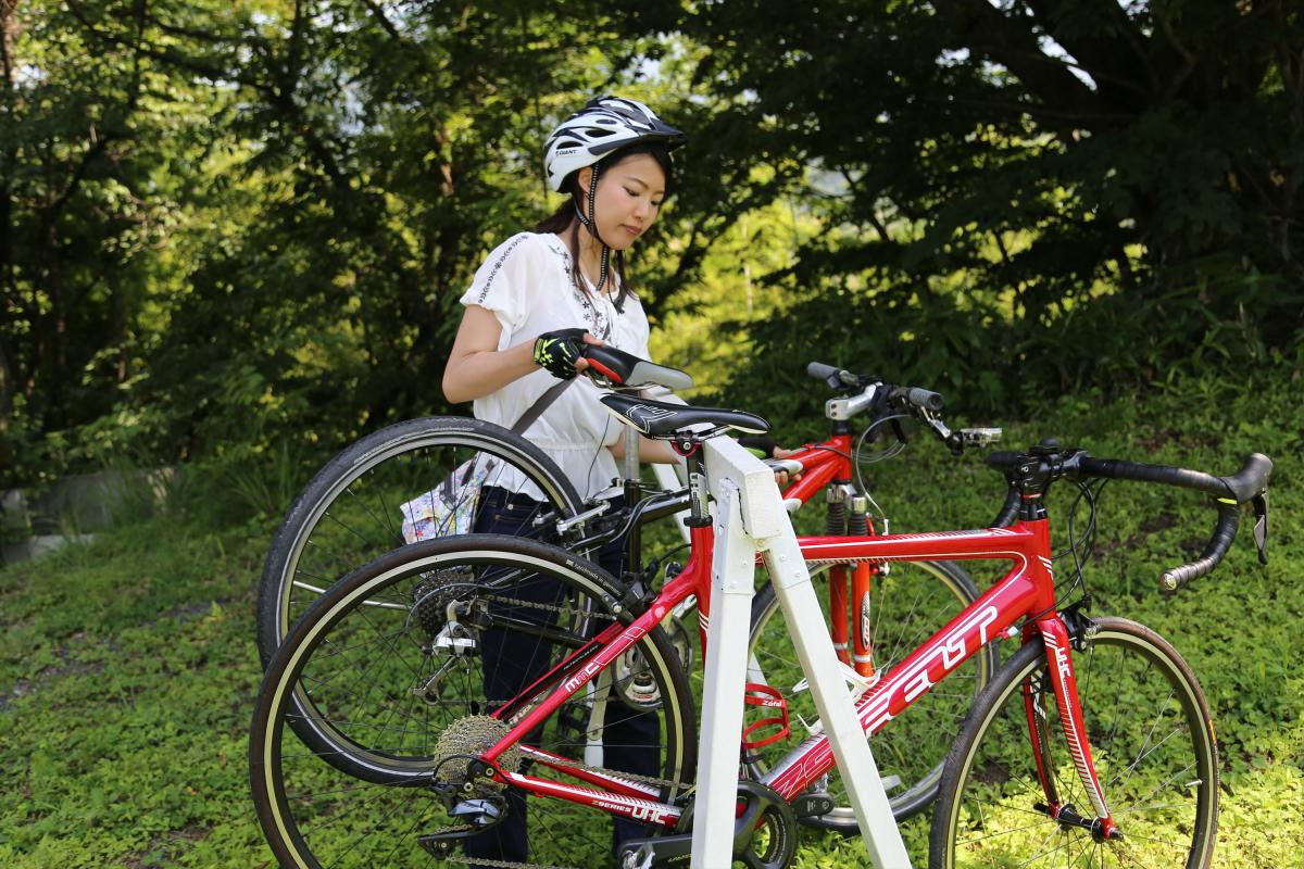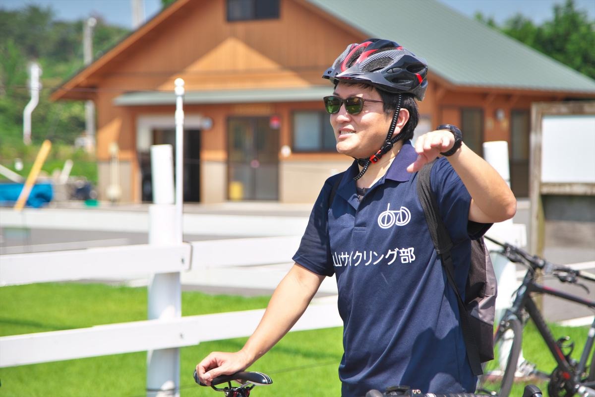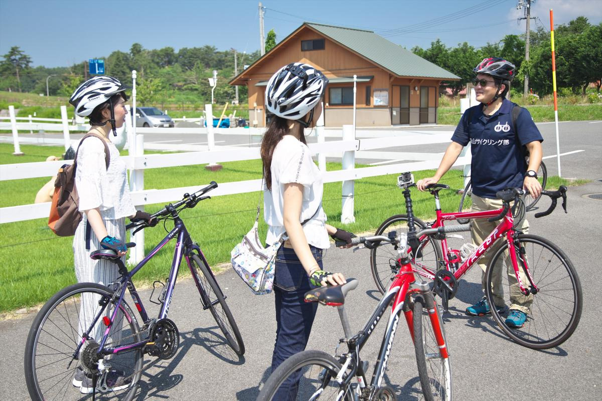 道案内をしてくださるのは、「蒜山サイクリング部」ガイドの東條さん。蒜山サイクリング部では、「散走サイクリング」という「走ること」が目的ではなく、 「自転車を利用して、見たり食べたり探したりすること」を目的としたサイクリングを提案しています。今回お借りしたのは、スタイリッシュかつ18段階の変速が可能なマウンテンバイク。走りやすさも文句無しです。この自転車で地域の最も魅力的なスポットを巡ることができるなんて、出発前からワクワクします!
