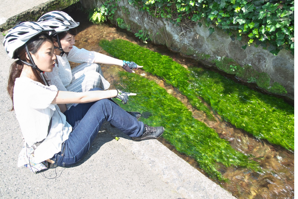 坂を下ったところで、きれいな水が流れる用水路に生える藻を眺めていると、近くにいらした地元の方が、「ヒルゼンバイカモだよ」と教えてくださいました! 水の流れが清らかな場所にしか生えないそうです。