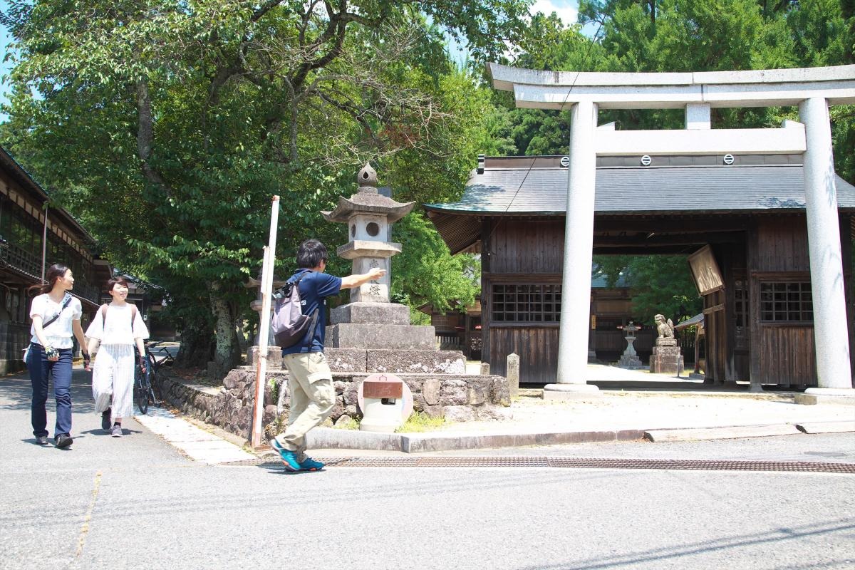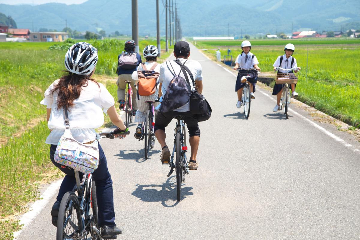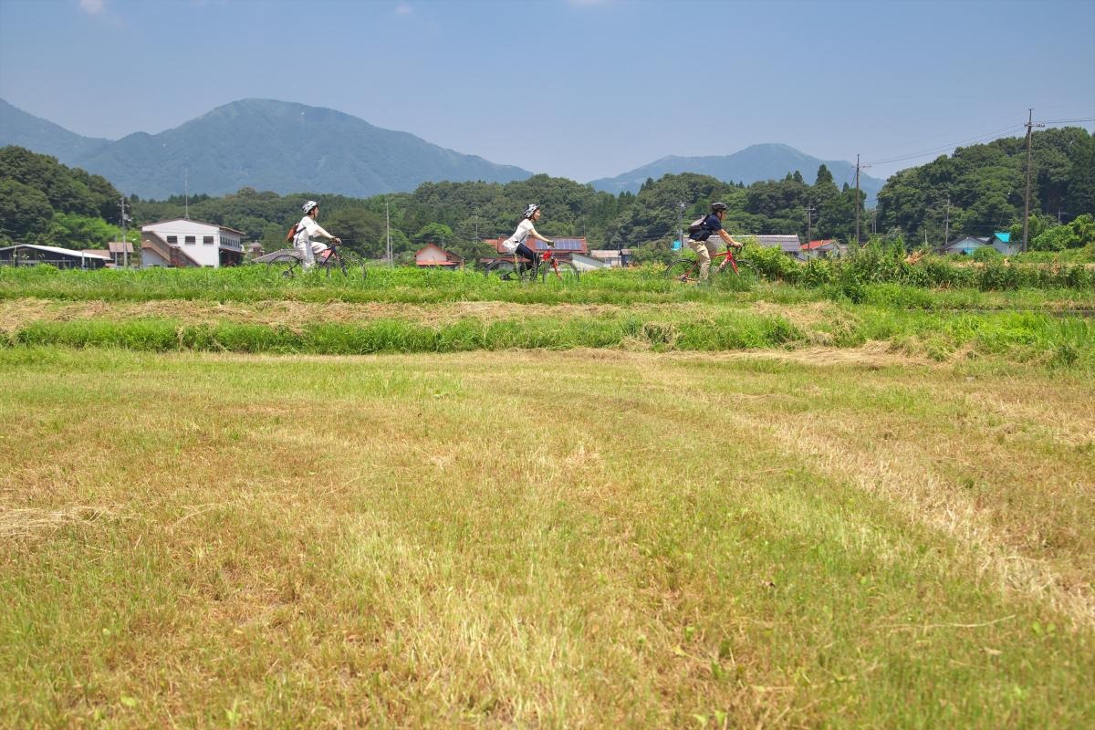 神社を後にし、今度は見渡す限り一面の田んぼが広がる田舎道のコースへ。日の光を浴びた草と地面が黄緑〜薄茶色に輝きながら織り成すグラデーションは、見る者の気分まで爽やかに晴れわたらせてくれるようです。のんびり田舎道を走りながらも、発見の連続に心がワクワクします。地元の学生さんたちと「こんにちは」と気持ちの良い挨拶を交わしながら、旅は続きます!
