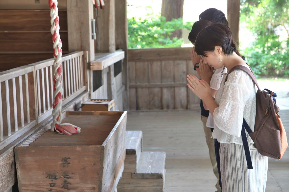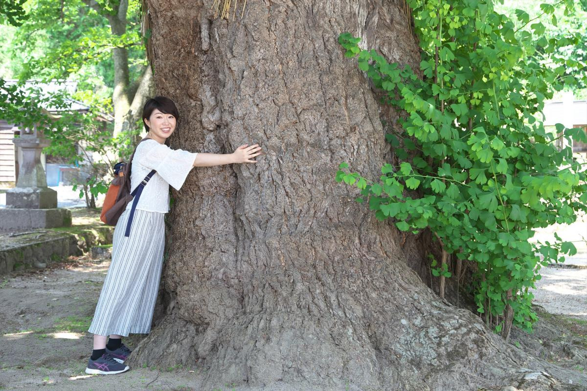 続いて向かった先は「福田神社」。鎌倉時代に起源を発するとされるこちらの神社は、文化財の宝庫です! 中でも国の指定重要無形民族文化財となっている「大宮踊り」は有名で、東條さんも習得に苦労したのだとか。御神木のイチョウの木は樹齢650年ほどとも言われ、気根と呼ばれる空中根が神秘的な雰囲気を高めていました。そっと抱きついてみると、不思議なパワーを感じます。