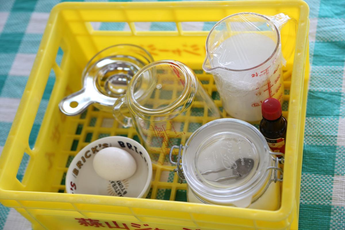 材料は、生クリーム、蒜山高原自慢・ジャージー牛乳に、卵の白身と砂糖、バニラエッセンス。そしてこれらを混ぜ合わせる特殊なボール状の器具に、材料を冷やすための氷と塩があればOKです!