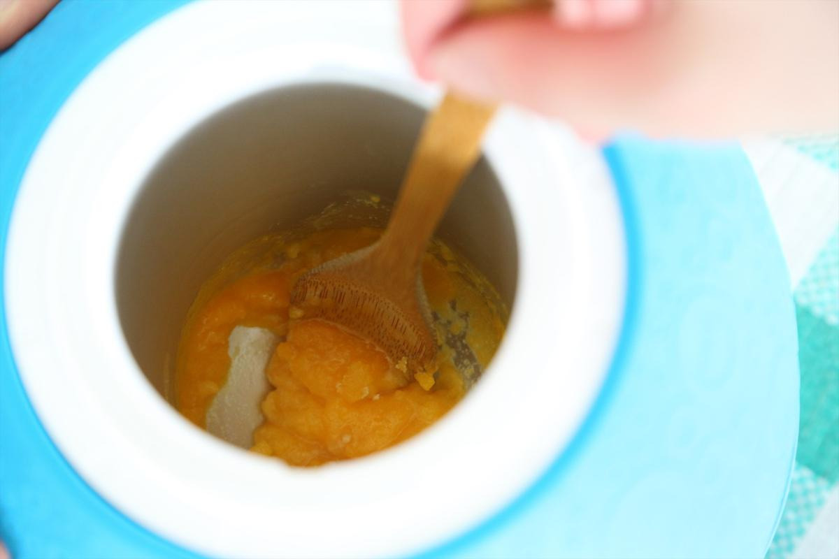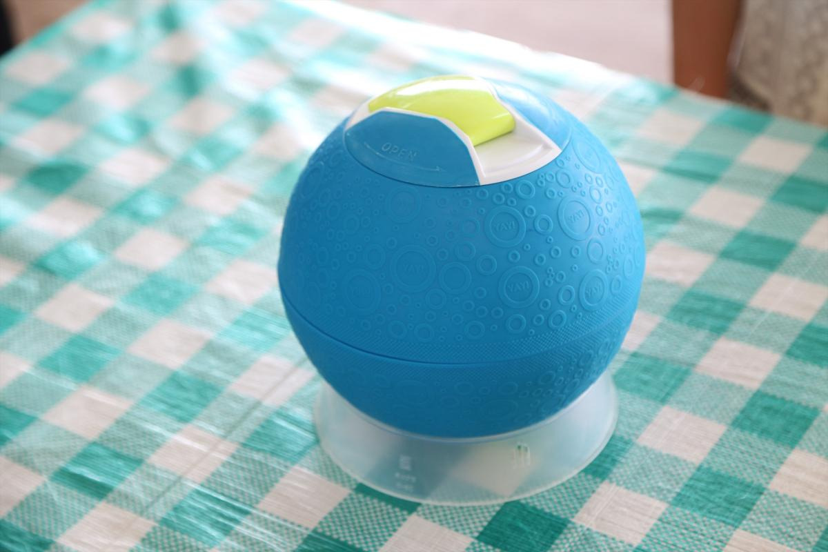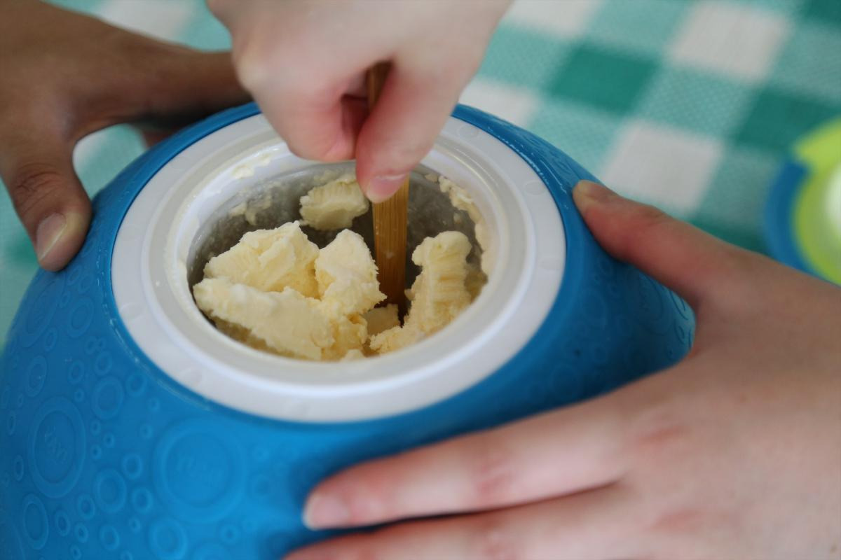丸3曲分ほどノリノリでボールを転がし、ようやく音楽ストップ。氷と塩を入れた側の蓋を開け、中身を流しに捨ててボールを拭いたら、いよいよアイスとご対面です!