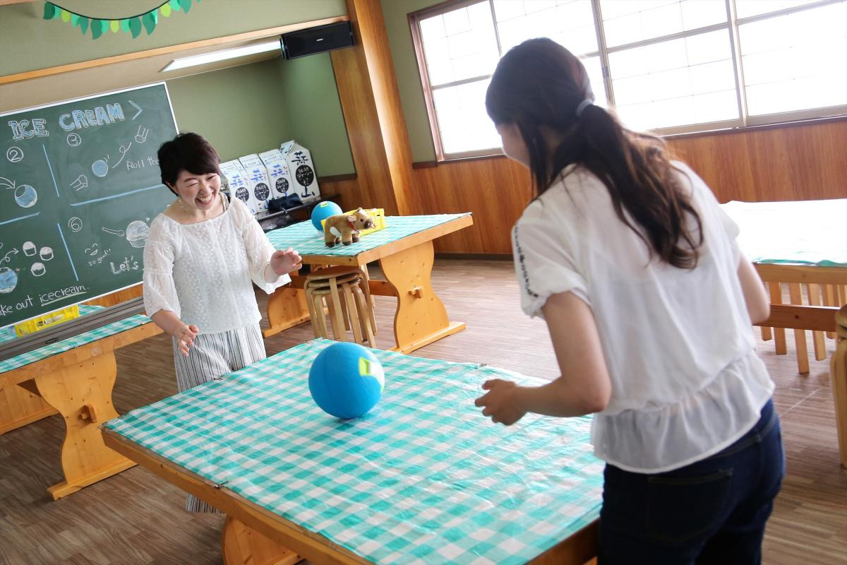 「ミュージック、スタート!どんどん転がしてください!」タンバリンとマイクを構え、ノリノリの先生たち。言われるがままに、ボールを転がします!・器具がボール型だったのは、このためだったのですね。全体がよく混ざるように、必死で転がし続けます。