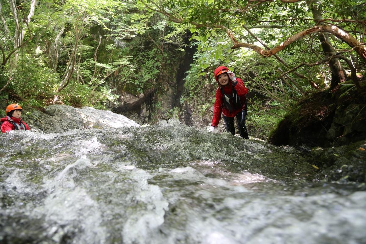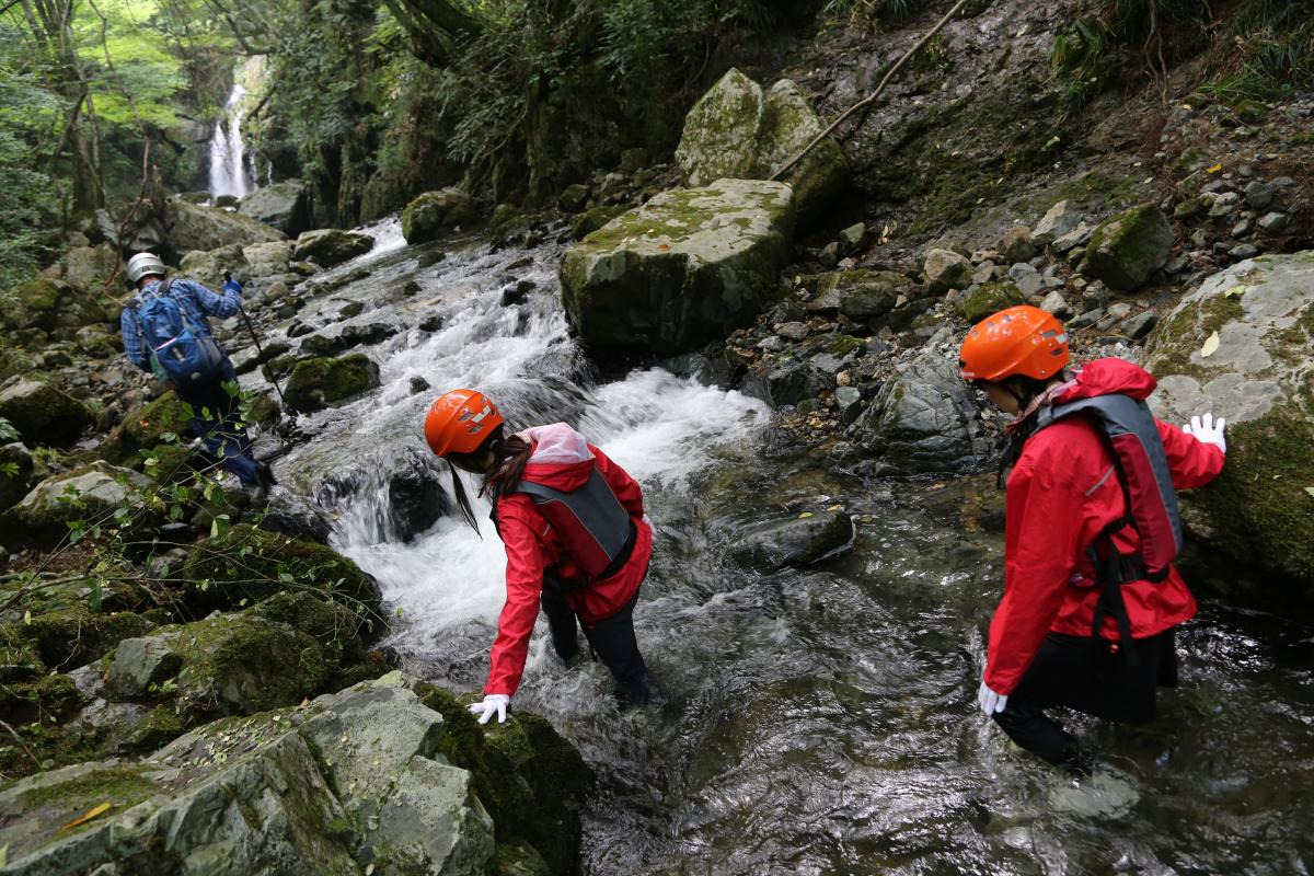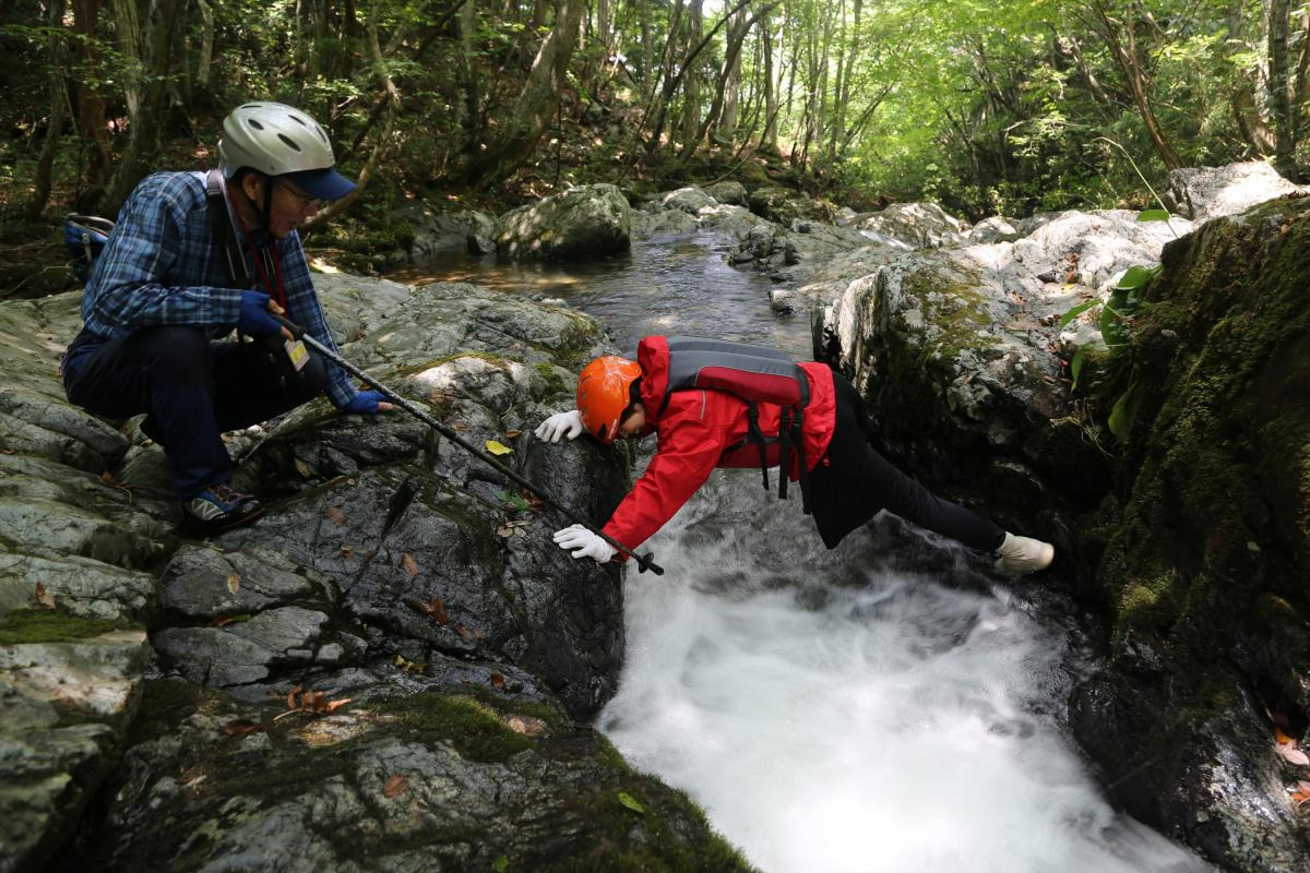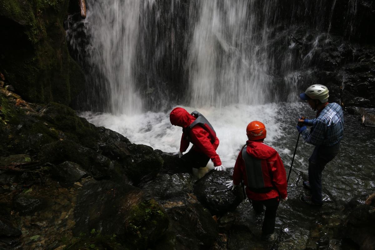 早速、川の中を流れに逆らって進みます。途中足場の少ないミニ滝登りなどのルートは、金山さんの的確なアドバイスに従って慎重に足を運びます。