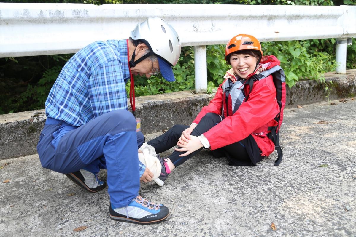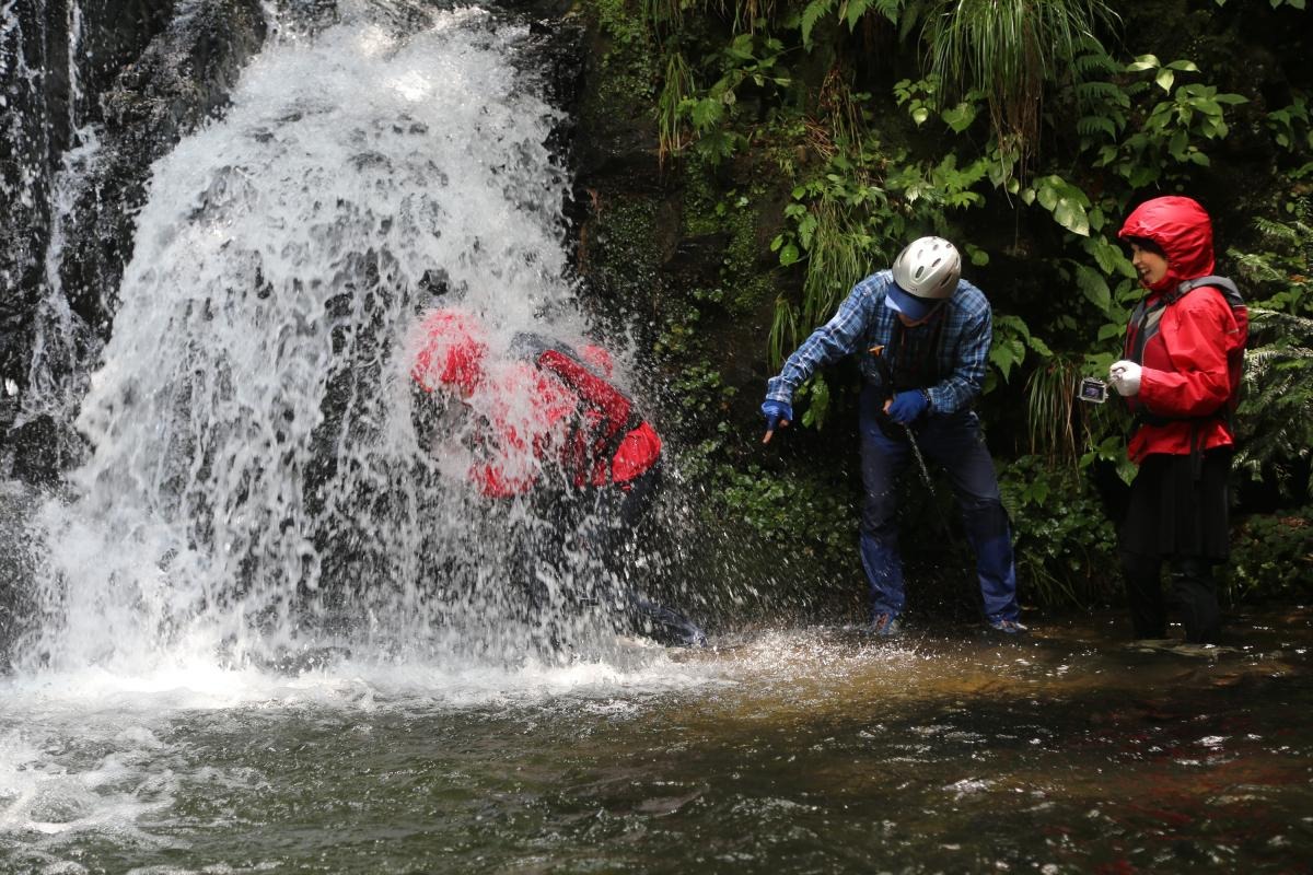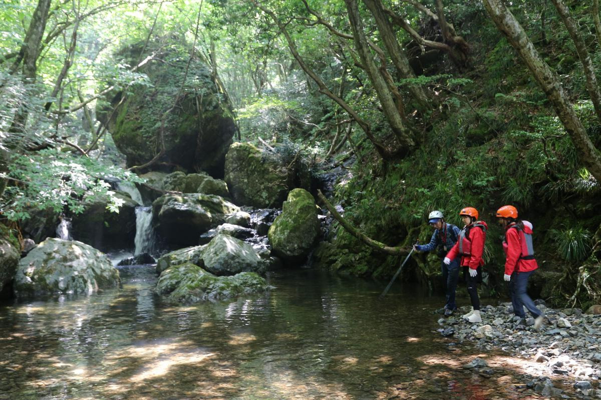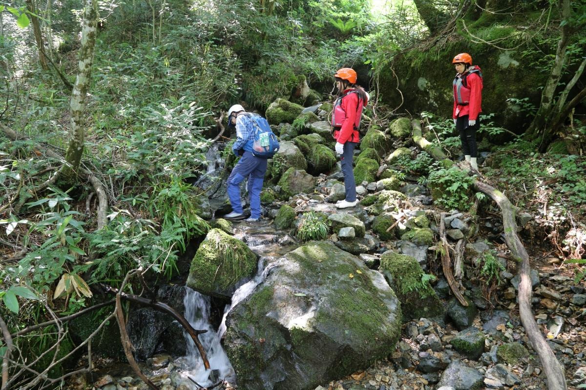 早速、川の中を流れに逆らって進みます。途中足場の少ないミニ滝登りなどのルートは、金山さんの的確なアドバイスに従って慎重に足を運びます。